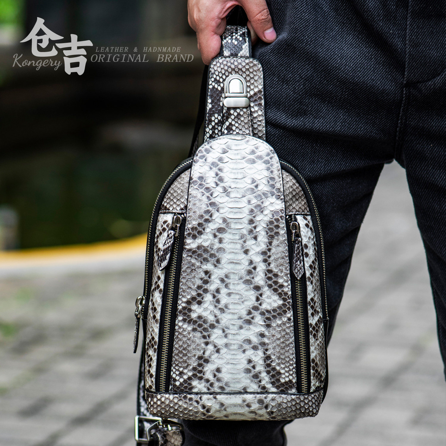 为您提供商品真皮斜挎包男牛皮胸包潮流百搭个性 单肩包背包 蟒蛇皮胸包 稀有的详细介绍,