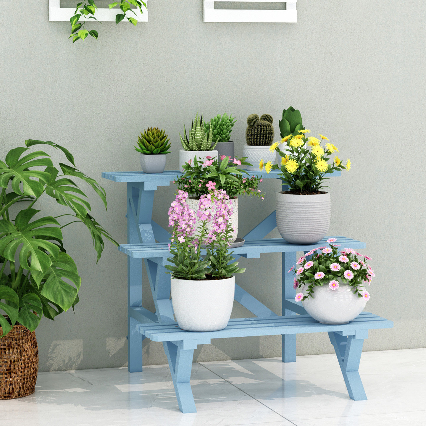 为您提供商品三层实木花架地中海阳台花园多肉花盆架户外防腐多层置物架 阶梯式的详细介绍,