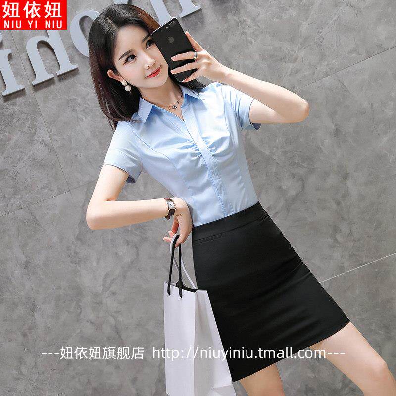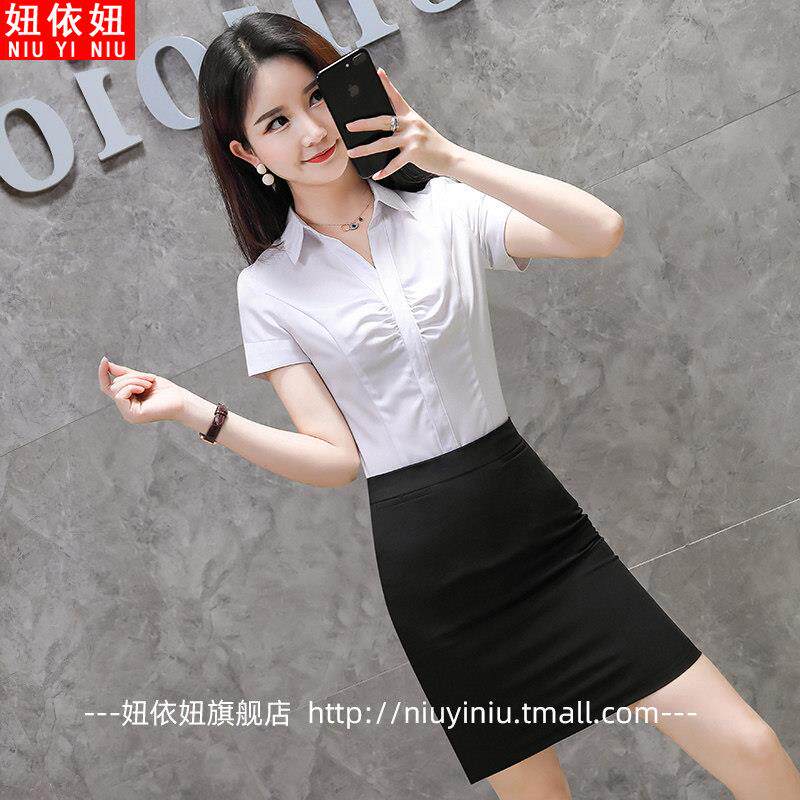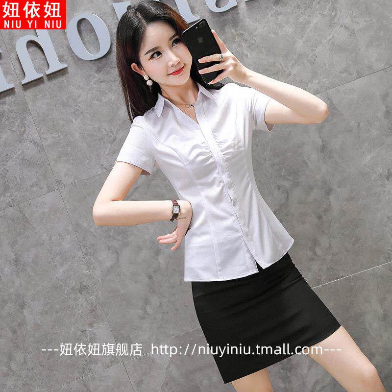 新款 工装 女夏季 上衣 职业短袖 衬衣气质工作服正装 时尚 V领白色衬衫