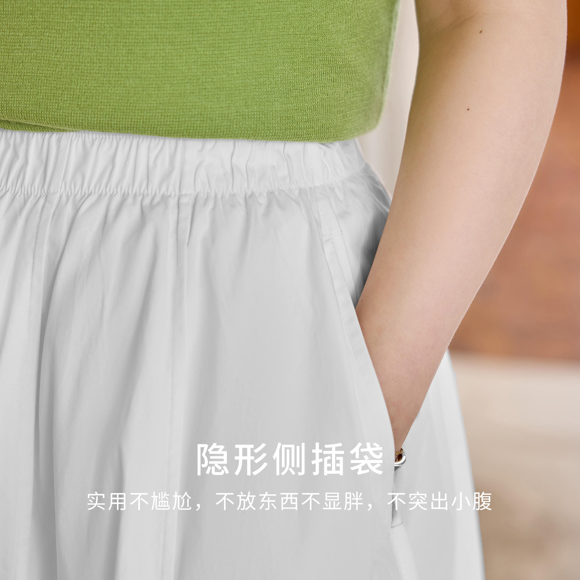 显瘦半身裙 白色百褶裙带口袋夏小个子松紧高腰弹力短裙女胖mm大码