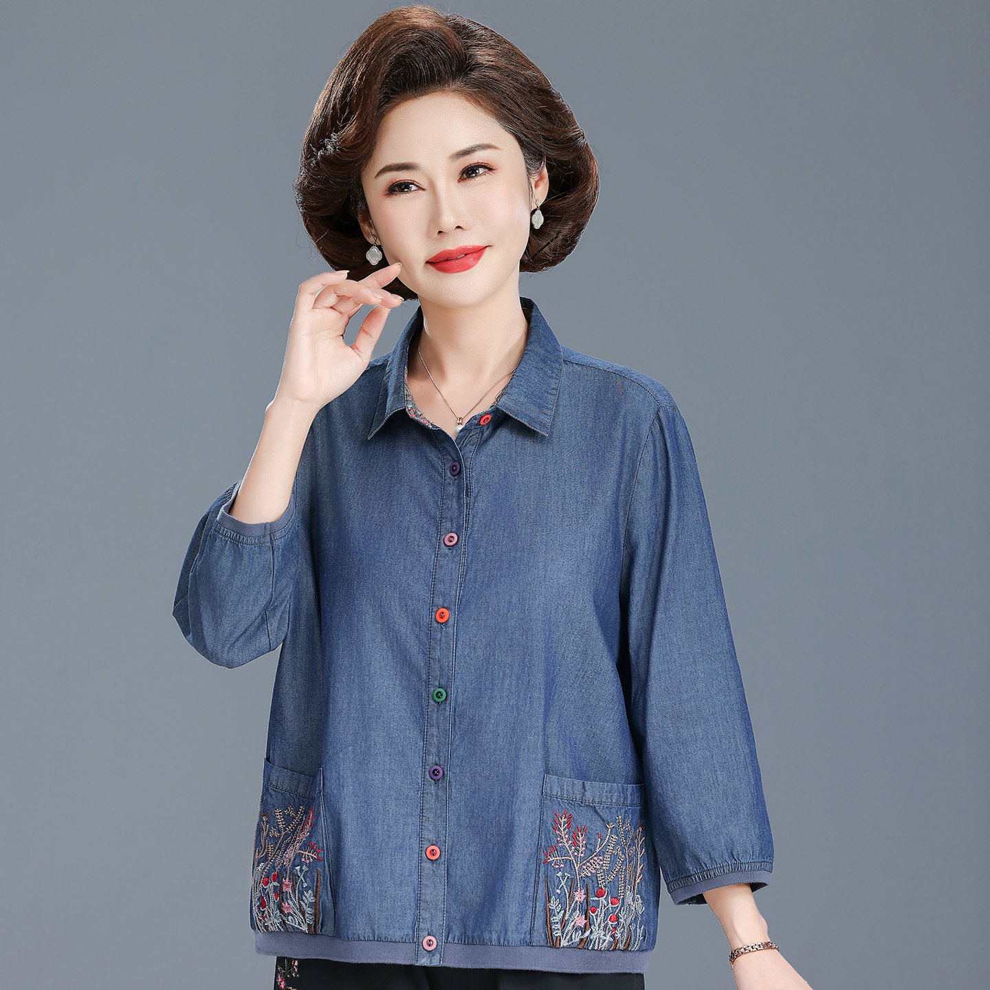 为您提供商品中老年新款 宽松大码 衬衣服奶奶开衫 女春夏气质薄外套纯棉牛仔衬衫的详细介绍,