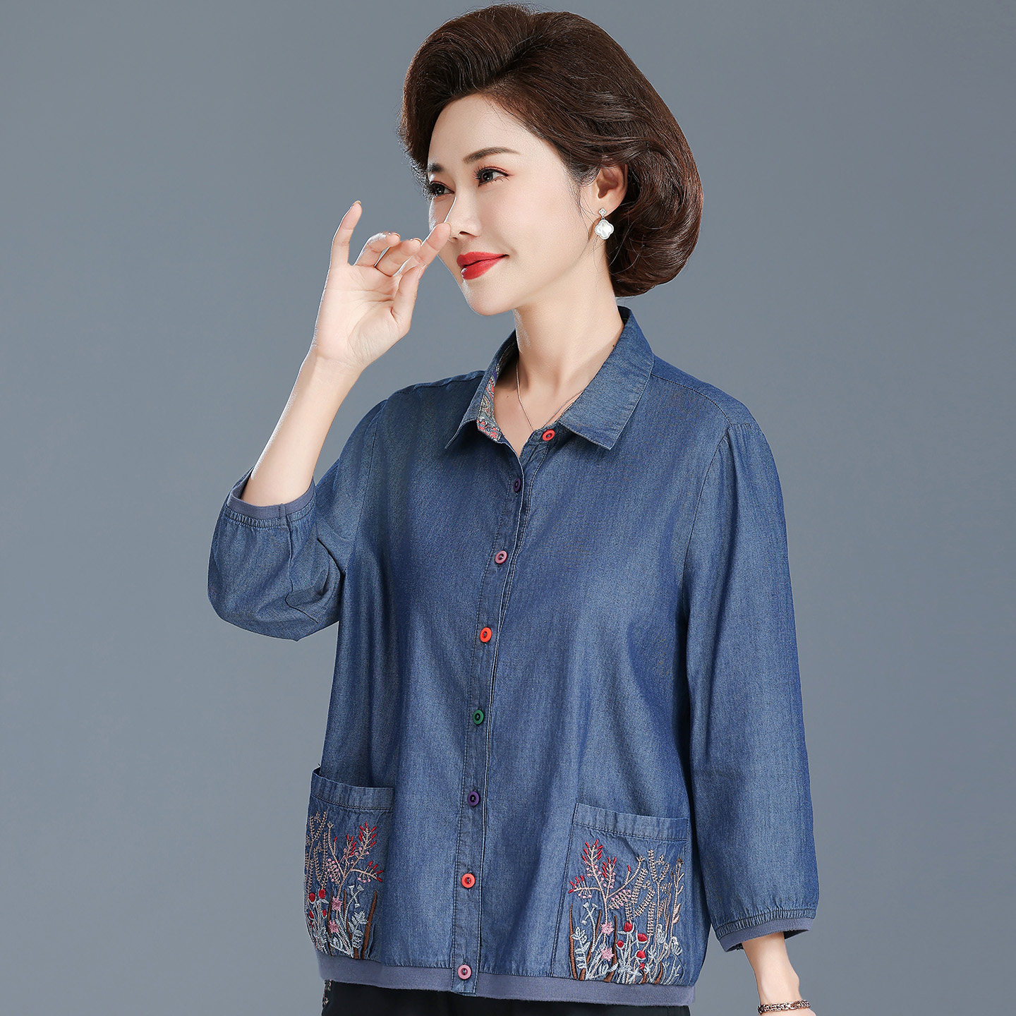 中老年新款 宽松大码 衬衣服奶奶开衫 女春夏气质薄外套纯棉牛仔衬衫