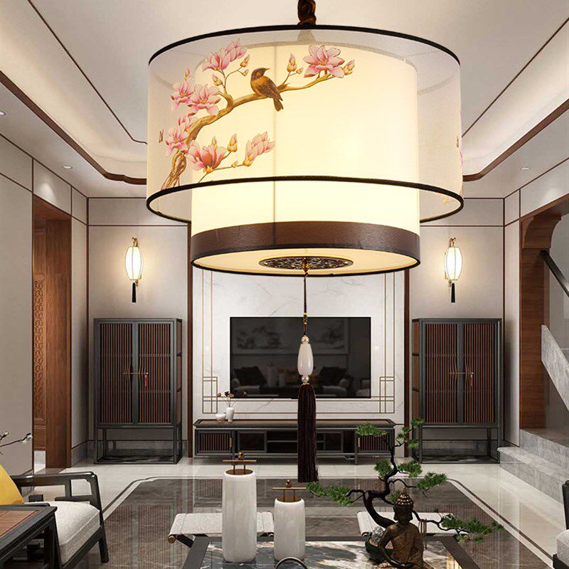饭店包厢餐桌灯圆形复古布艺灯酒店宴会厅餐饮灯具 餐厅吊灯新中式