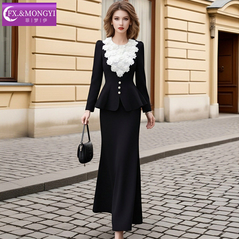 菲梦伊法式 套装 女春季 荷叶边花朵黑色上衣鱼尾长裙 高级感轻熟时尚由