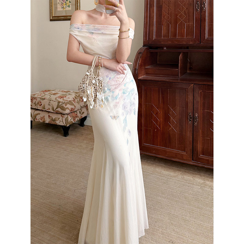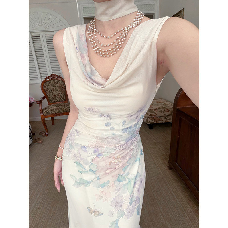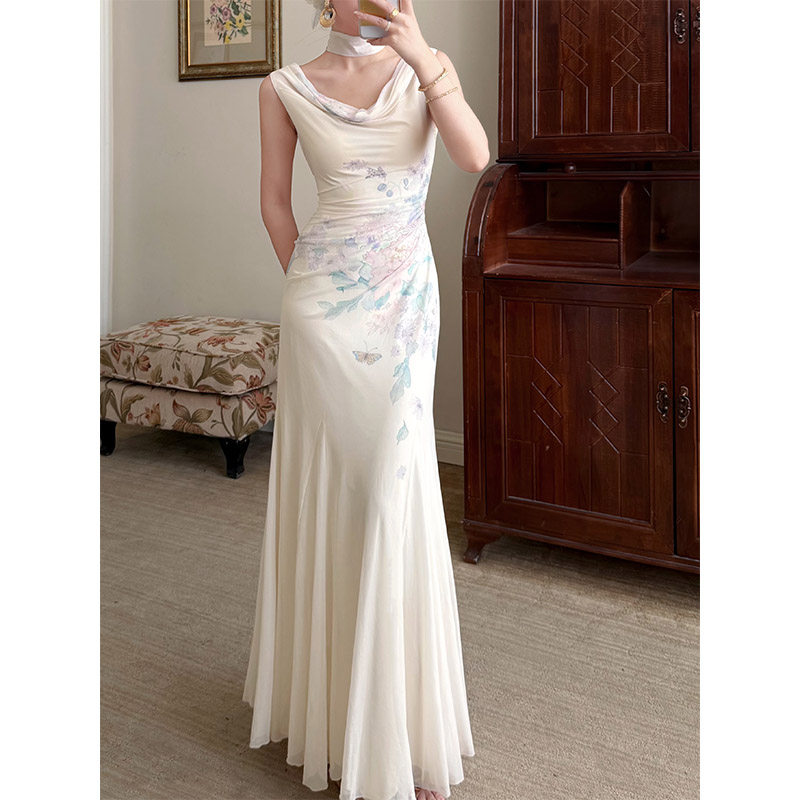 山野逸梦2026年春夏新品 连衣长裙女夏显瘦荡领优雅气质 椿樱时由