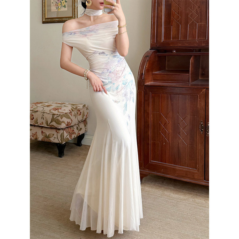 黑色挂脖连衣裙女夏季 赫本风拼接气质收腰露肩长裙 法式 pusumede