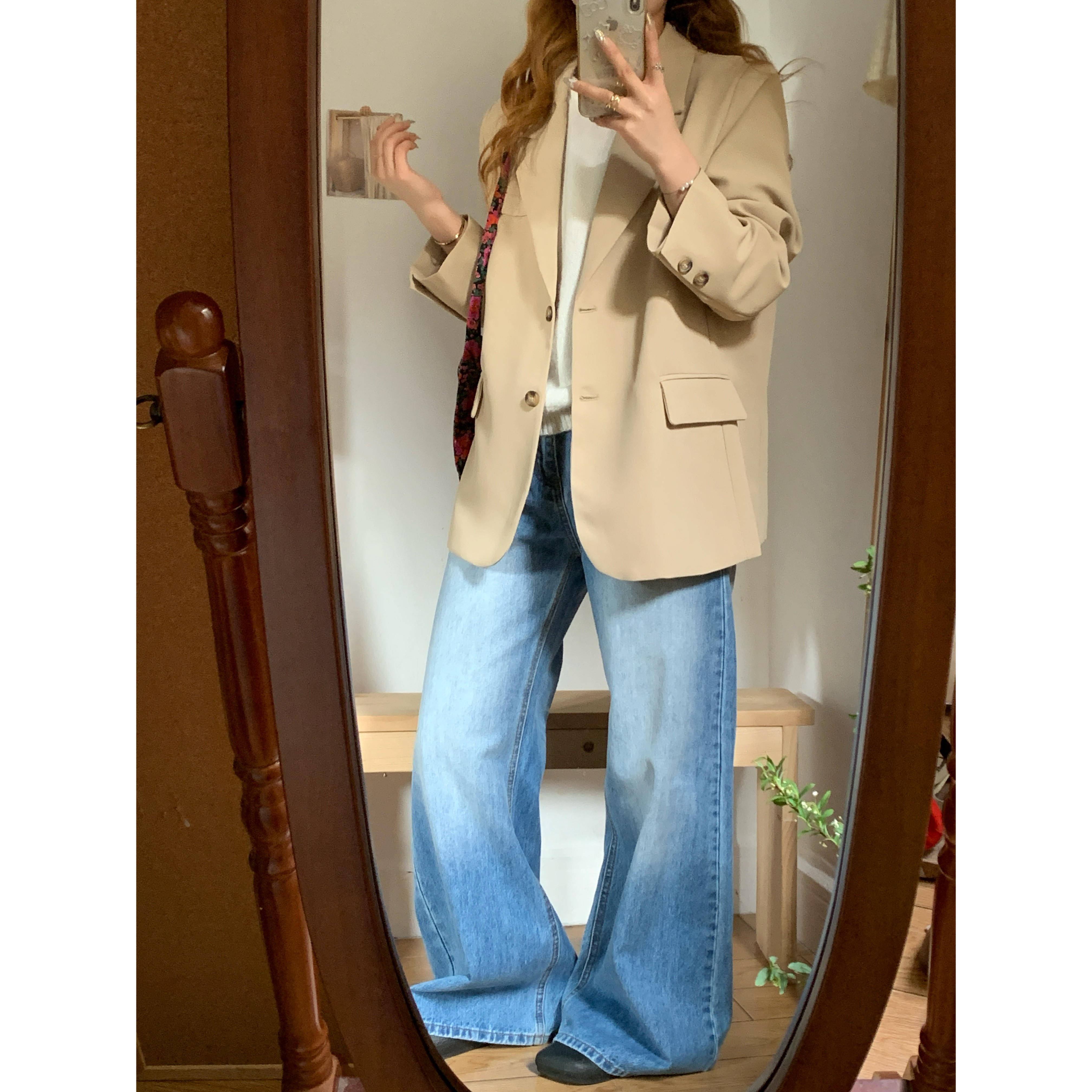 拖地长裤 折痕美式 水洗牛仔裤 女春秋新款 宽松直筒阔腿裤由