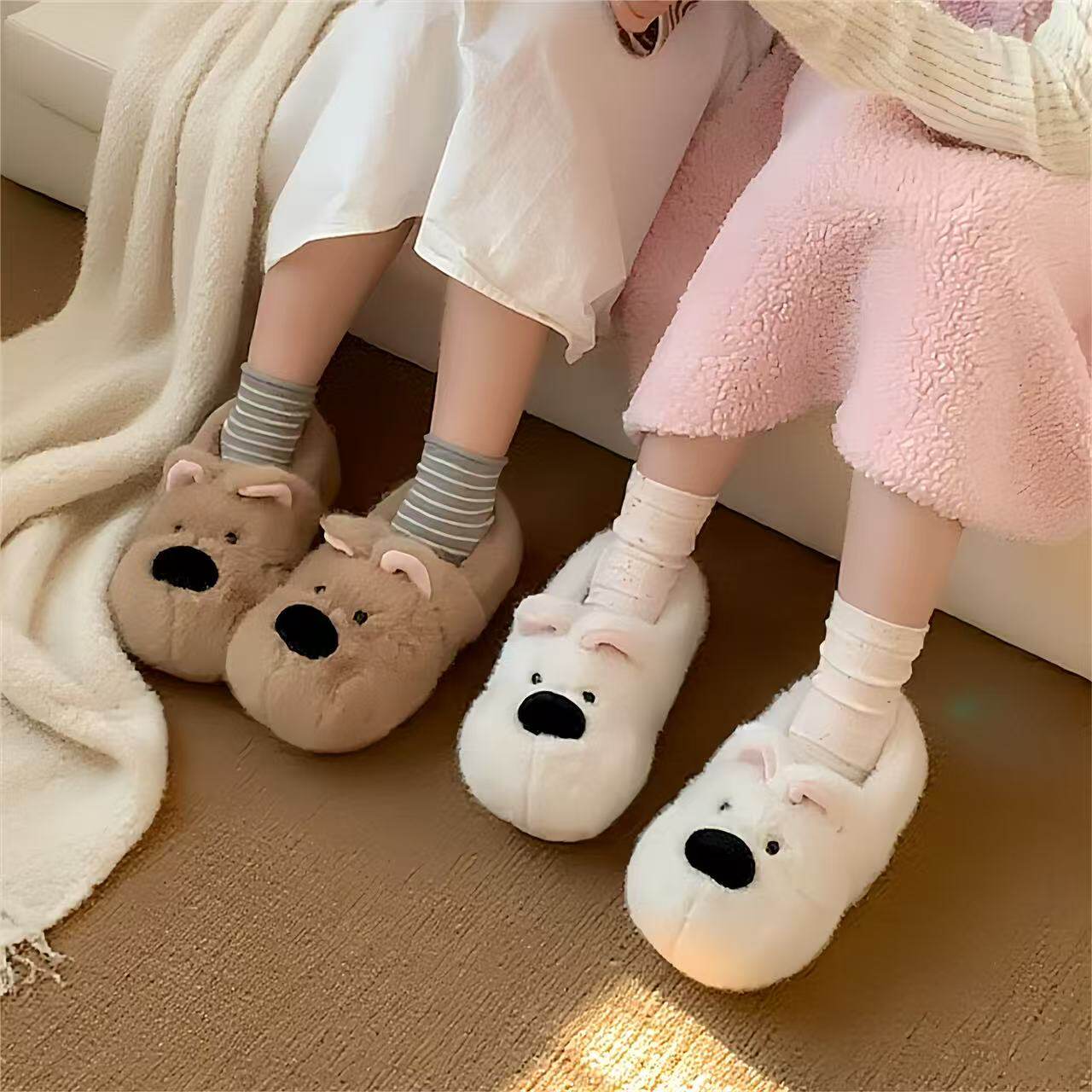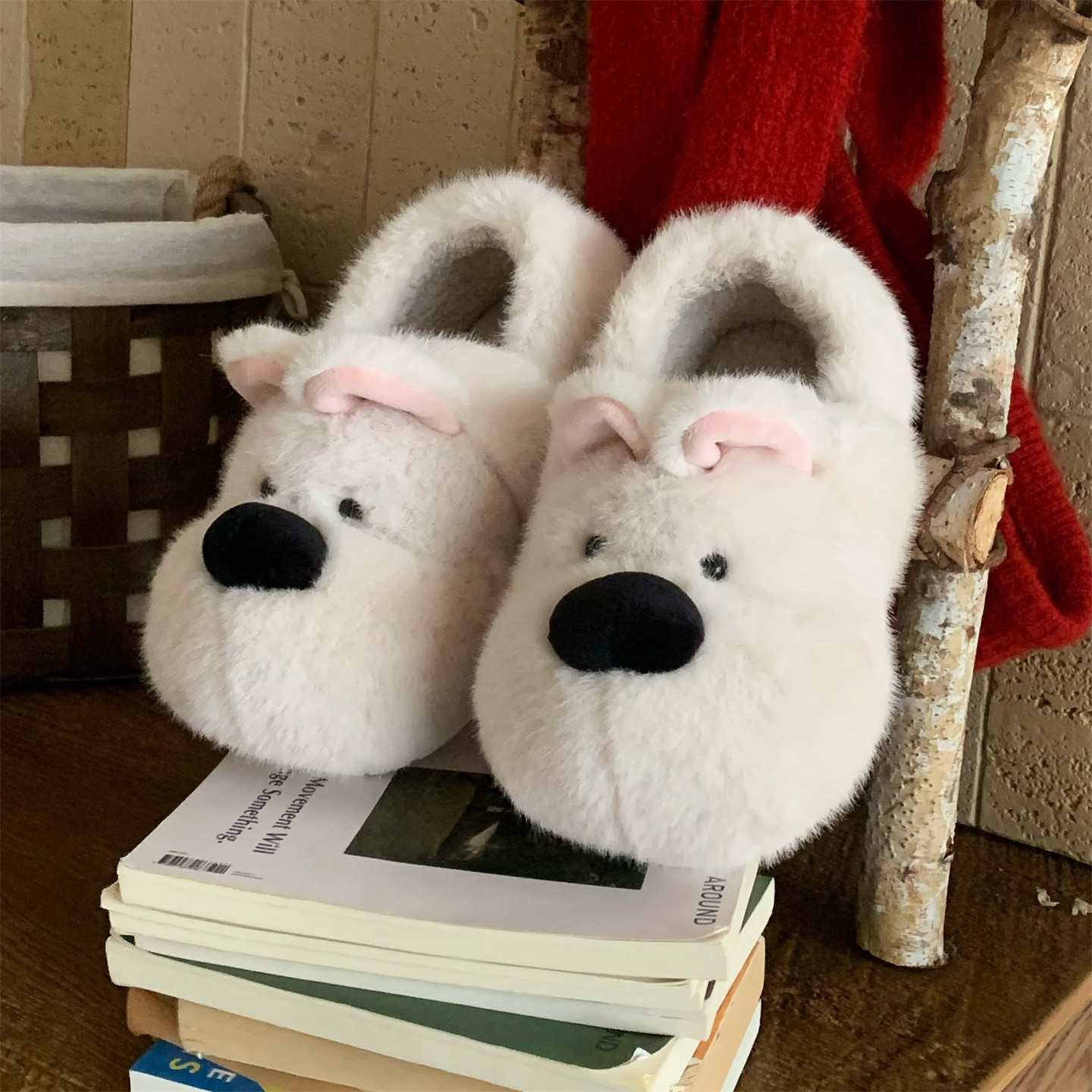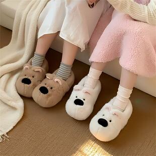男女保暖包跟防滑情侣家用毛毛鞋 冬 趣味西高地小狗棉拖鞋 细细条