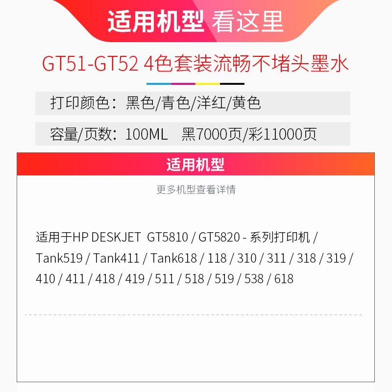tank519 tank618打印机墨水 天威适用HP惠普GT51黑色GT52墨水 5820 tank419 tank411 tank418 GT5810 tank311由