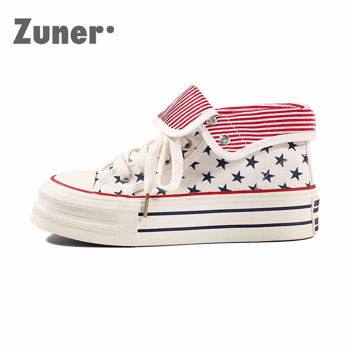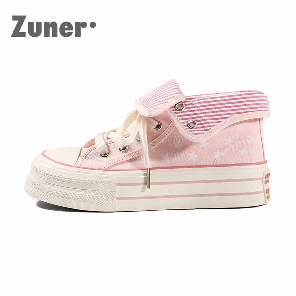 尊儿星星条纹厚底高帮帆布鞋 新款 小众学生翻折两穿板鞋 女2026春季由