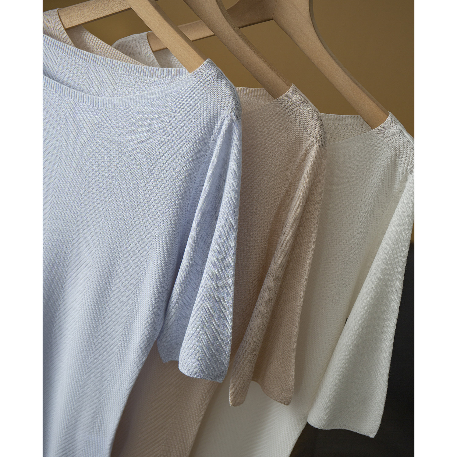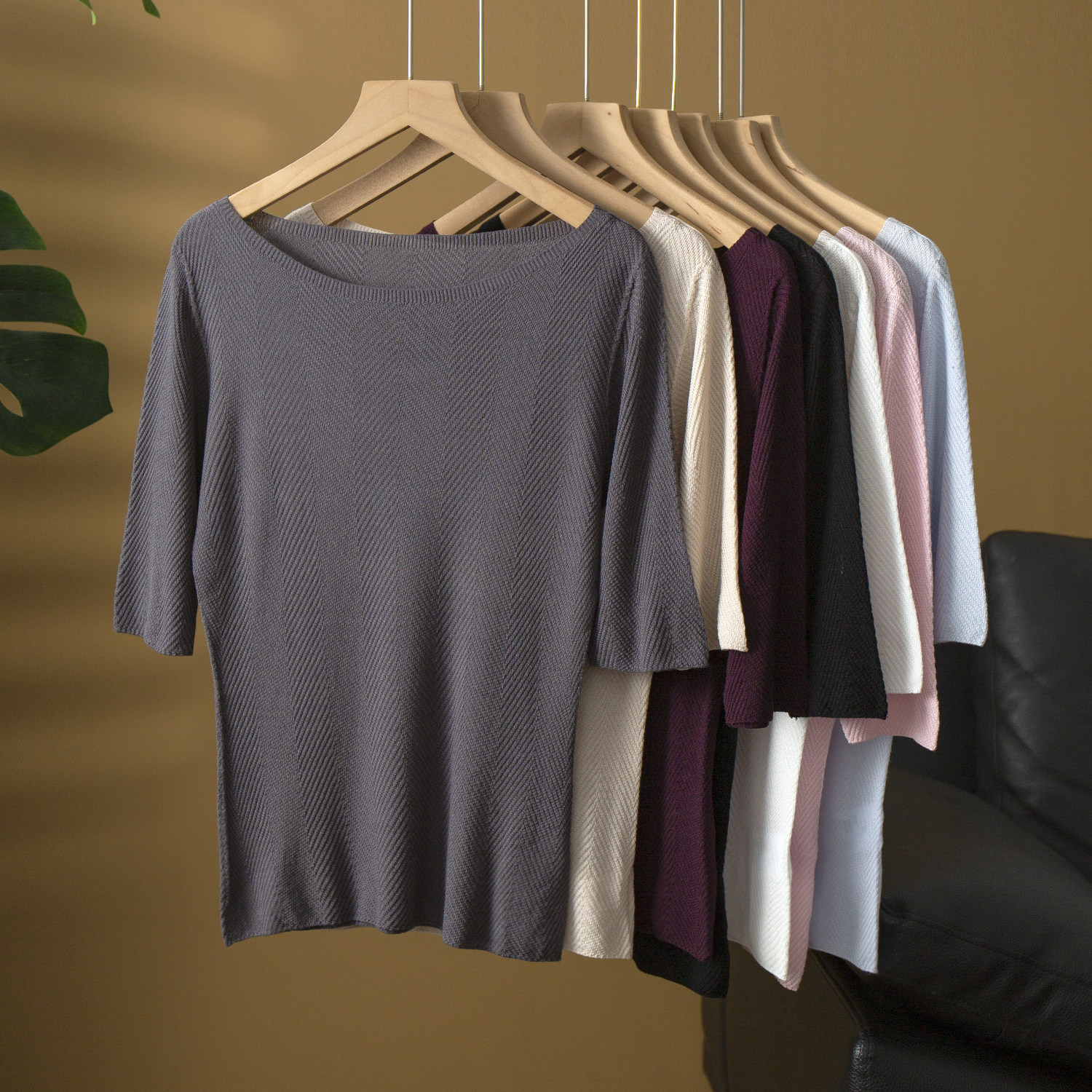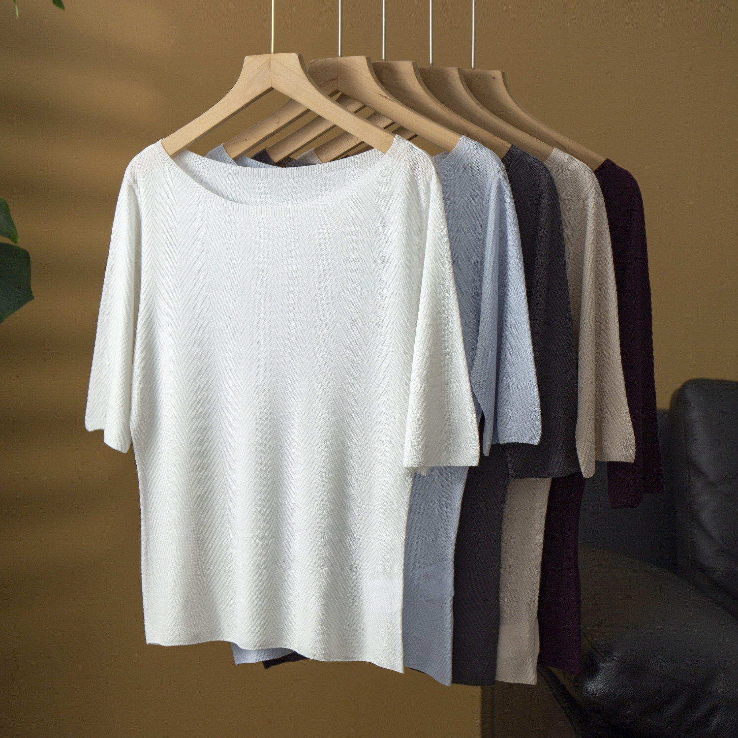 高端 短袖 上衣打底衫 莱赛尔桑蚕丝无缝一字领鱼骨纹针织T恤女夏季