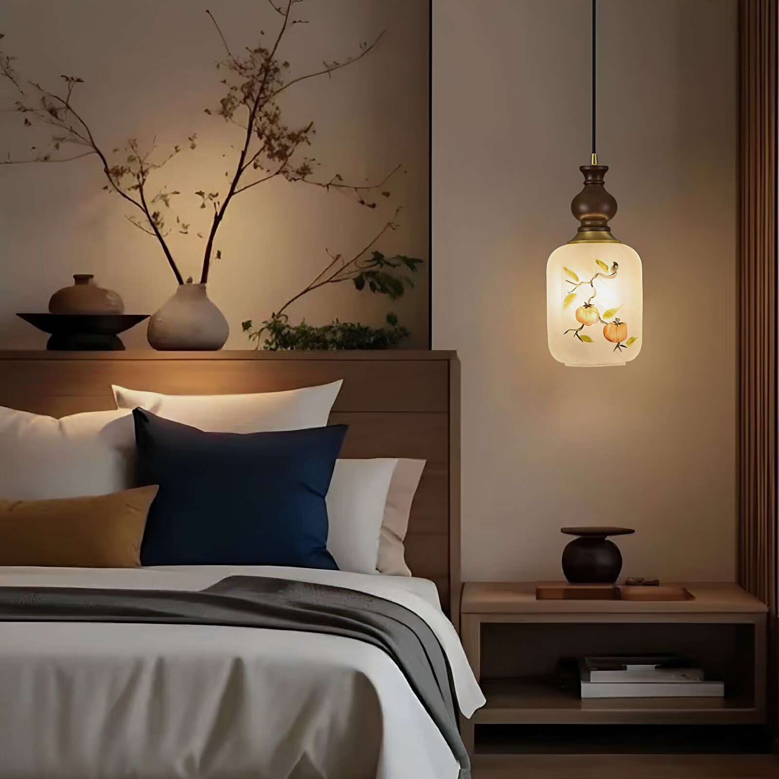 卧室吊灯全铜玻璃灯罩手绘花鸟图案复古书房中古风小吊灯 新中式由