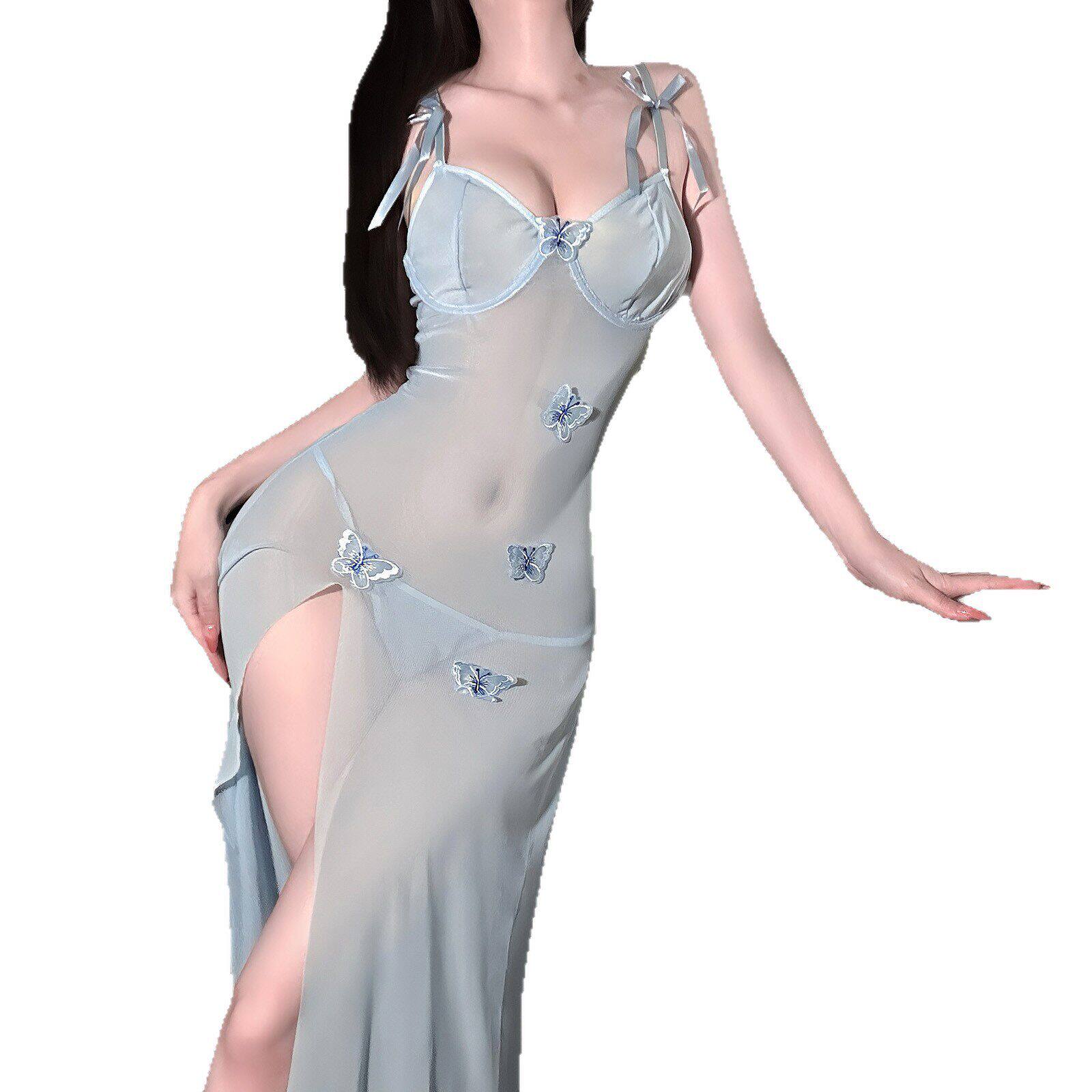 情趣内衣带钢圈性感透视网纱诱惑露背聚拢小胸约会战袍吊带睡衣裙