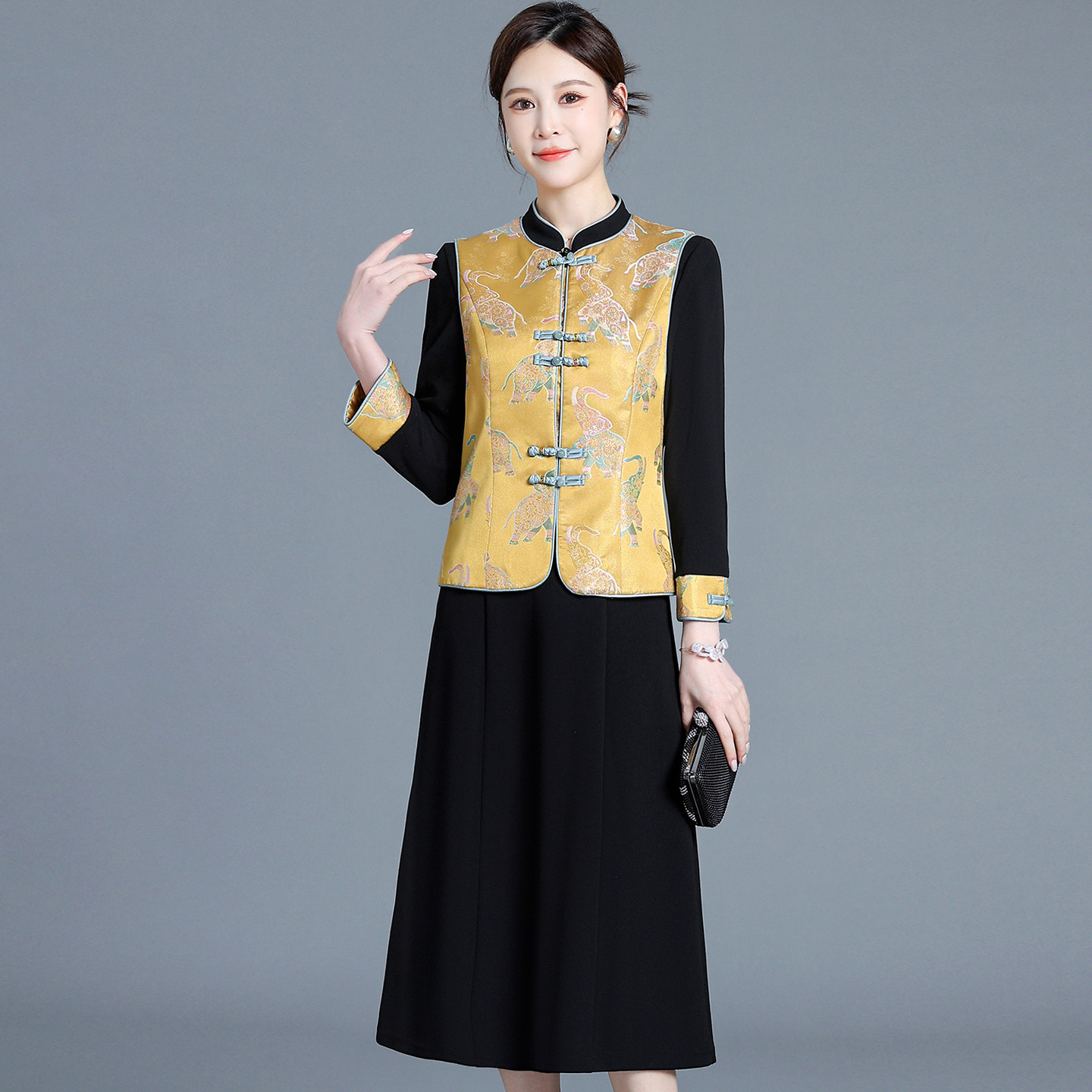 为您提供商品新款 新中式 国风马甲套装 裙2026春季 丝绒两件套裙 洋气印花拼接长袖的详细介绍,