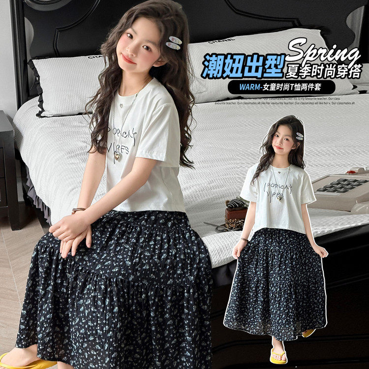 女童夏装 2026网红洋气碎花半身裙中大童女孩短袖 两件套休闲装 套装由