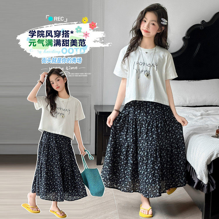 女童夏装 2026网红洋气碎花半身裙中大童女孩短袖 两件套休闲装 套装