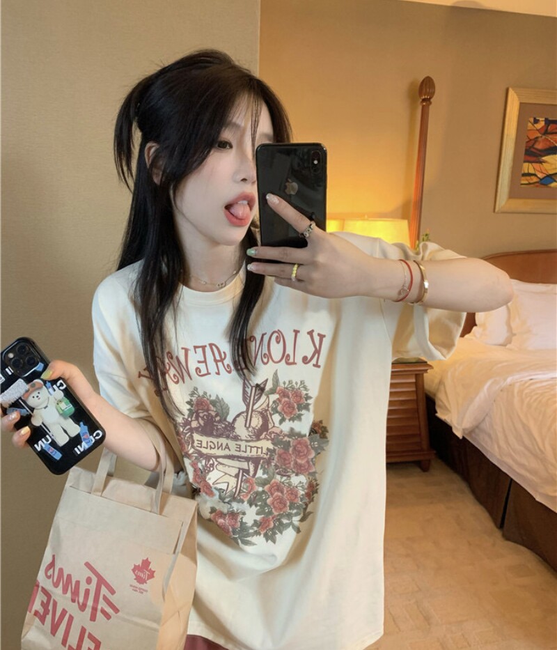 2025春夏季 慵懒风女美式 复古玫瑰印花短袖 T恤女早春宽松潮流 新款