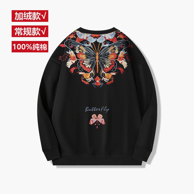 为您提供商品重工国潮100%纯棉卫衣男春季 T恤大码 中国风庄周梦蝶刺绣圆领长袖的详细介绍,