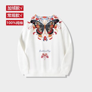 重工国潮100%纯棉卫衣男春季 T恤大码 中国风庄周梦蝶刺绣圆领长袖由