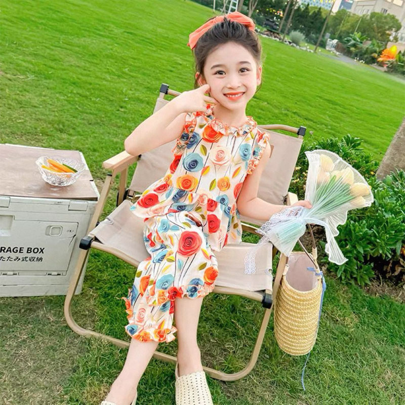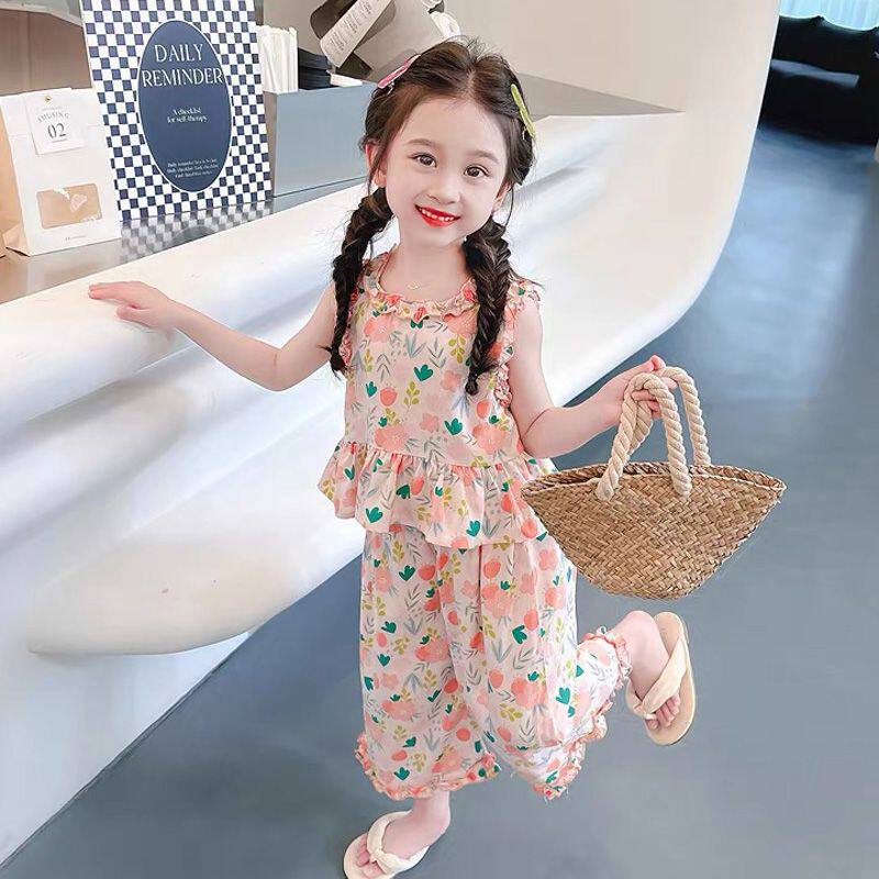 薄款 女宝宝夏季 洋气女孩棉绸碎花两件套 无袖 儿童装 套装 2026新款
