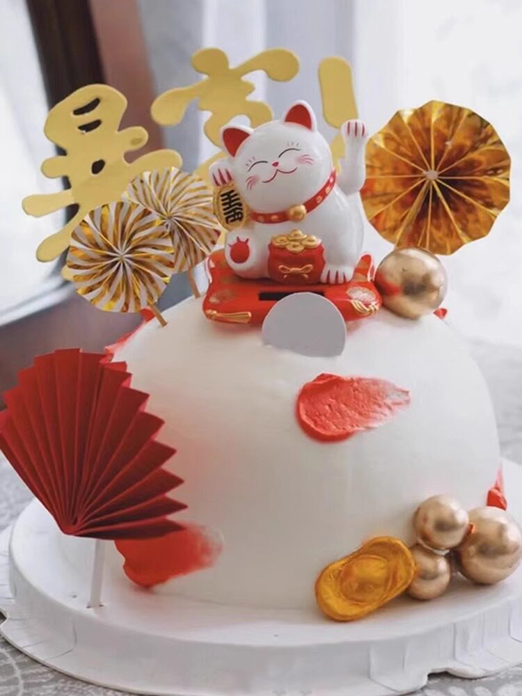 饰摆件乔迁之喜中国风新年福如东海寿比南山甜品插牌 招财猫蛋糕装