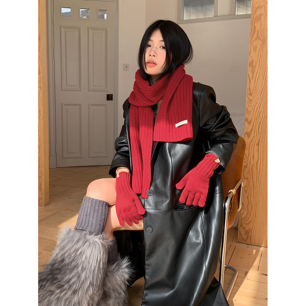 郑佰万高品质100%澳洲羊毛围巾女秋冬百搭纯色针织围脖手套两件套