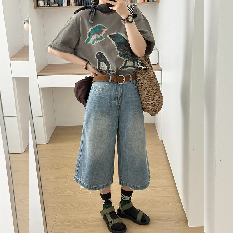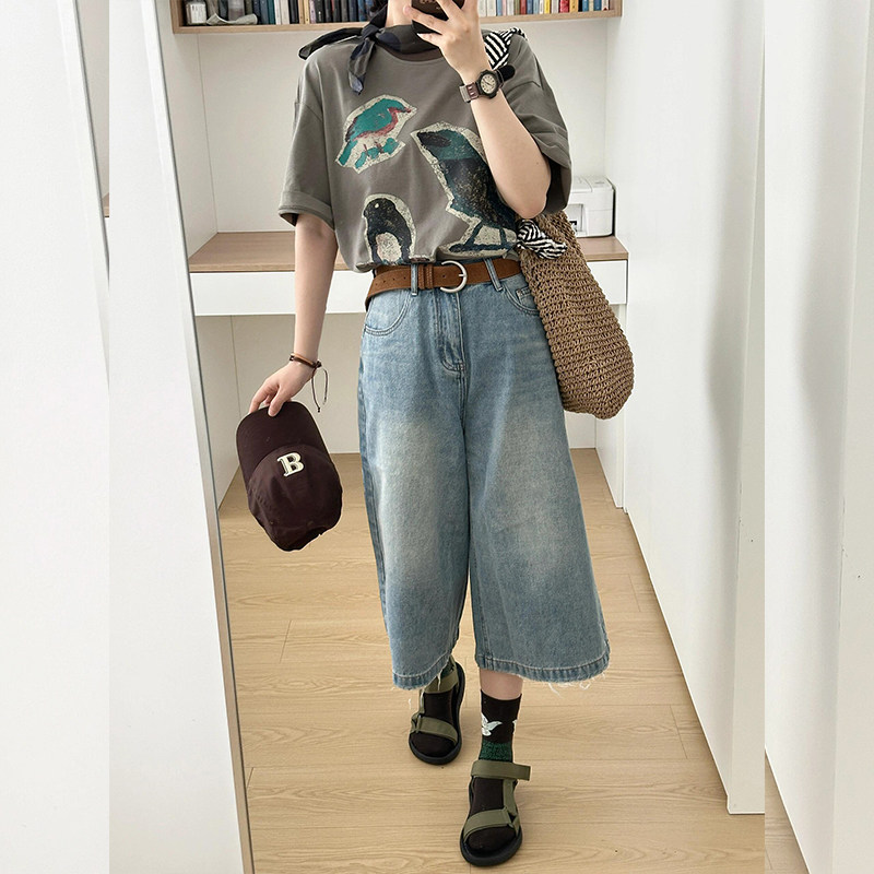 韩系ootd穿搭一整套女2026夏季 t恤牛仔七分裤 休闲套装 松弛感短袖由