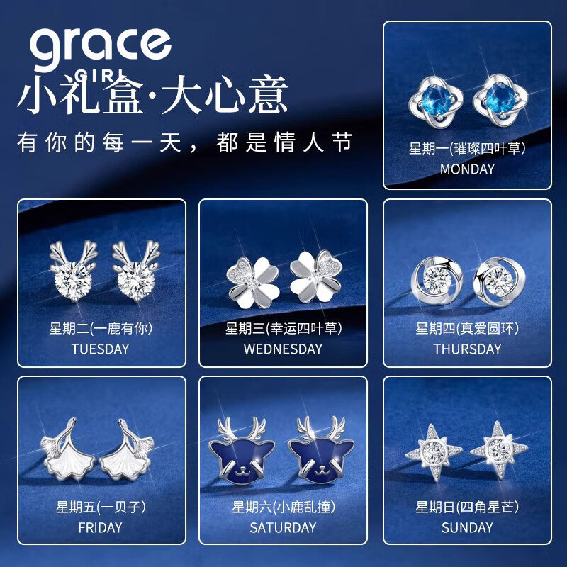 星期999纯银2026爆款 高级女生日礼物 Girl一周耳钉礼盒套装 Grace由