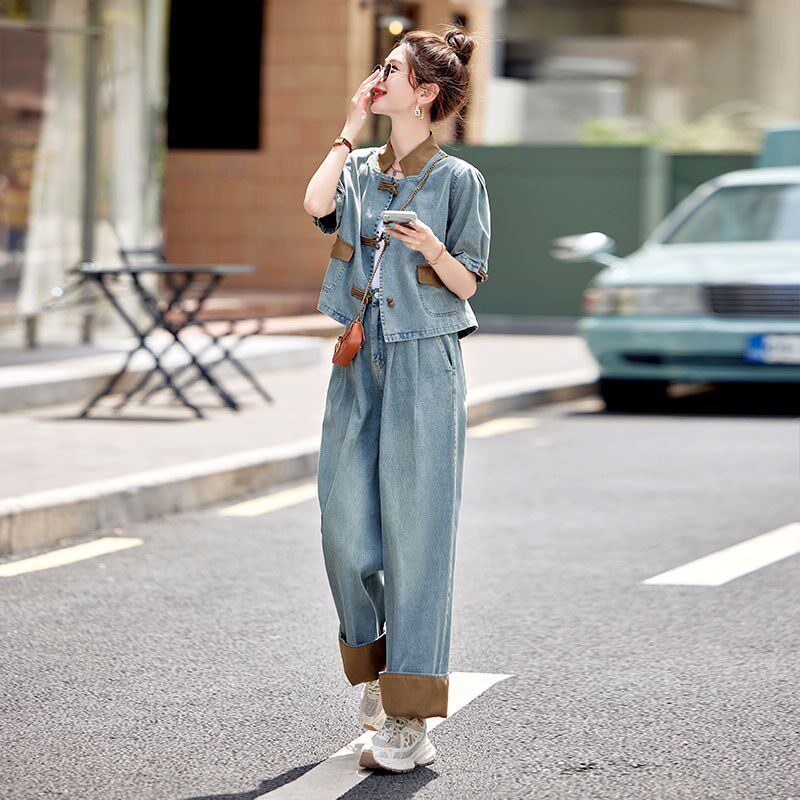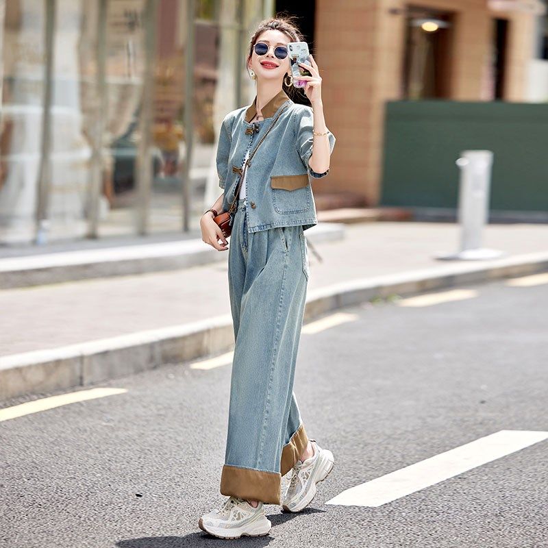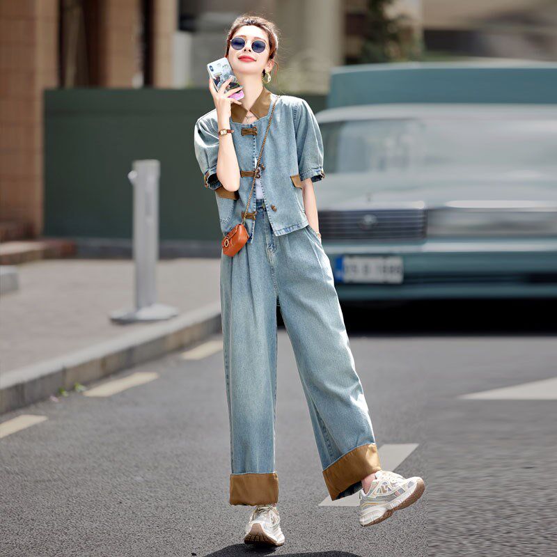 洋气新中式 夏季 国风盘扣上衣两件套 时尚 女2024新款 牛仔阔腿裤 套装