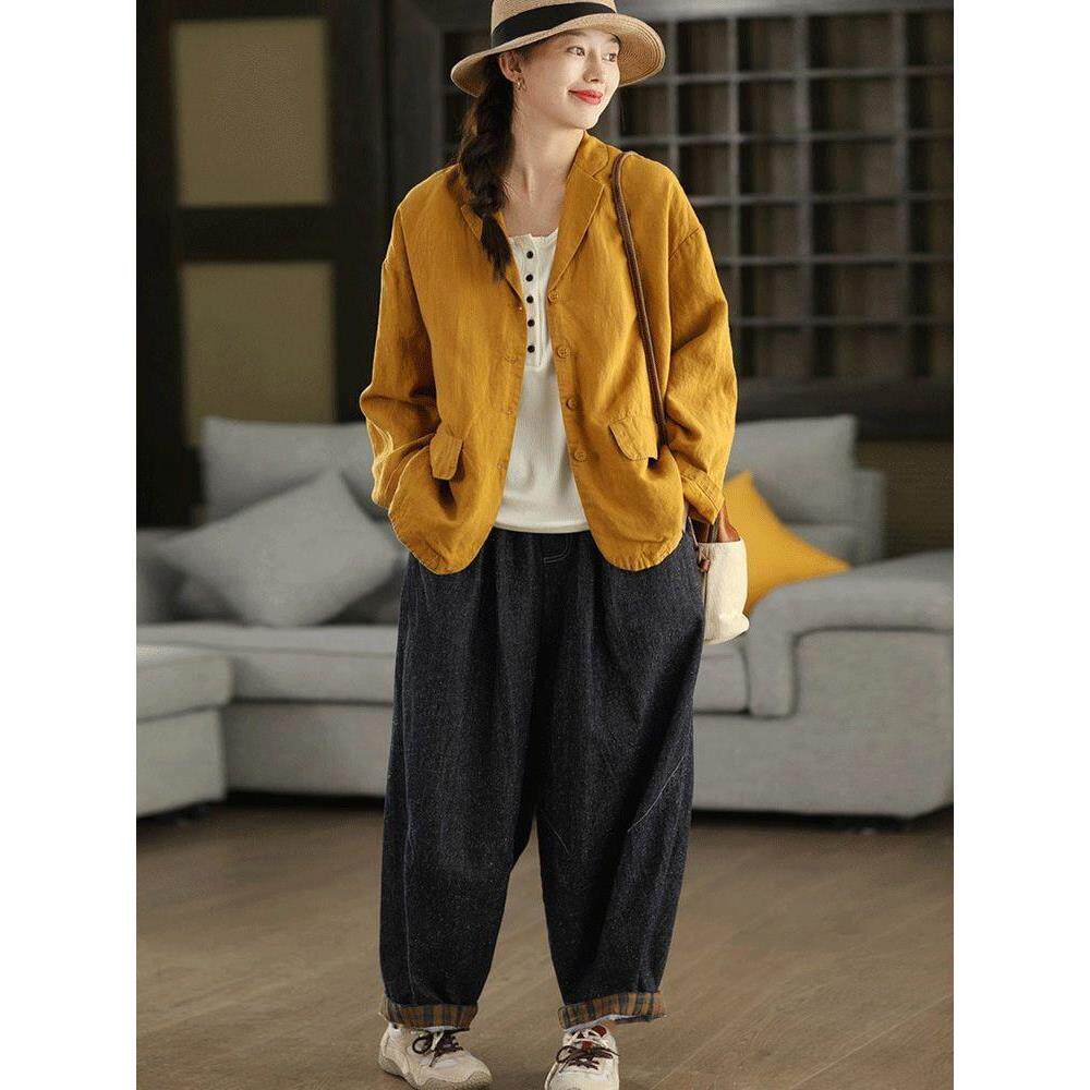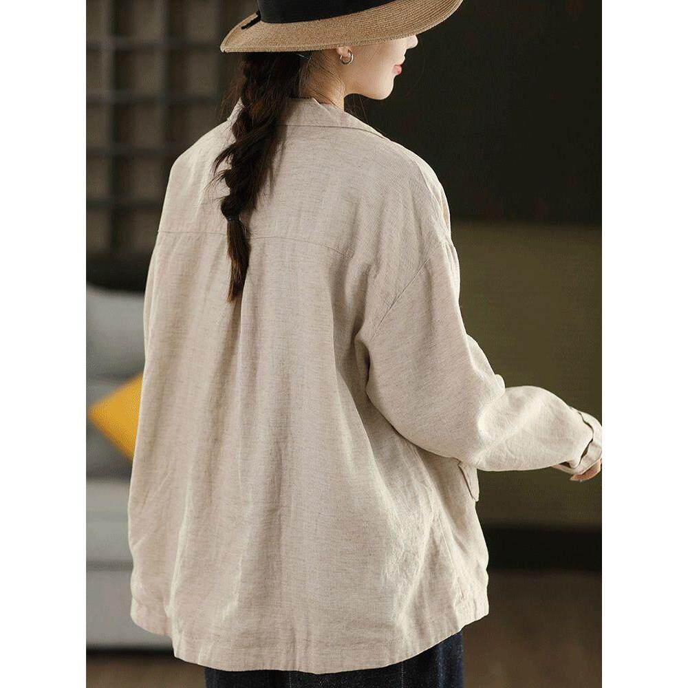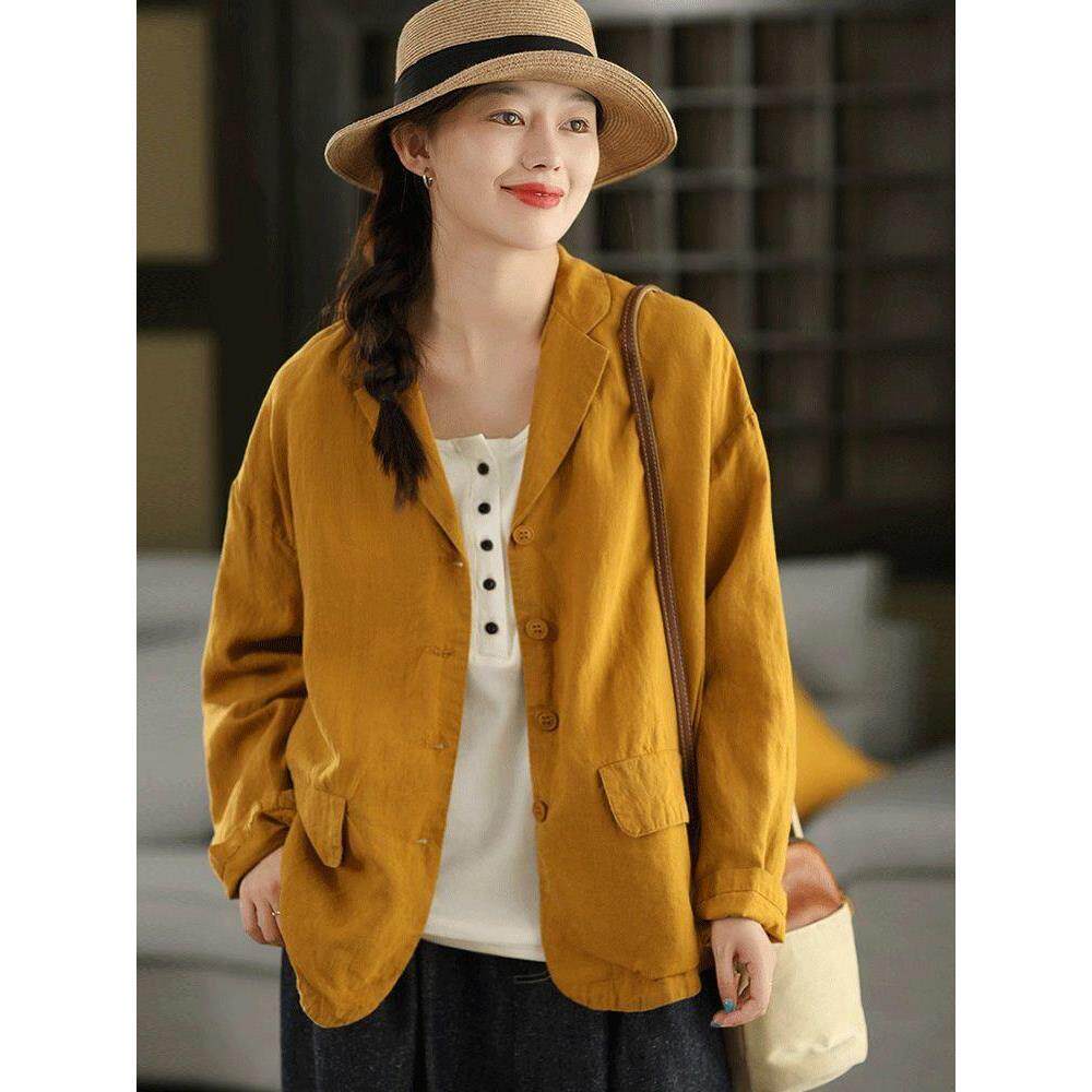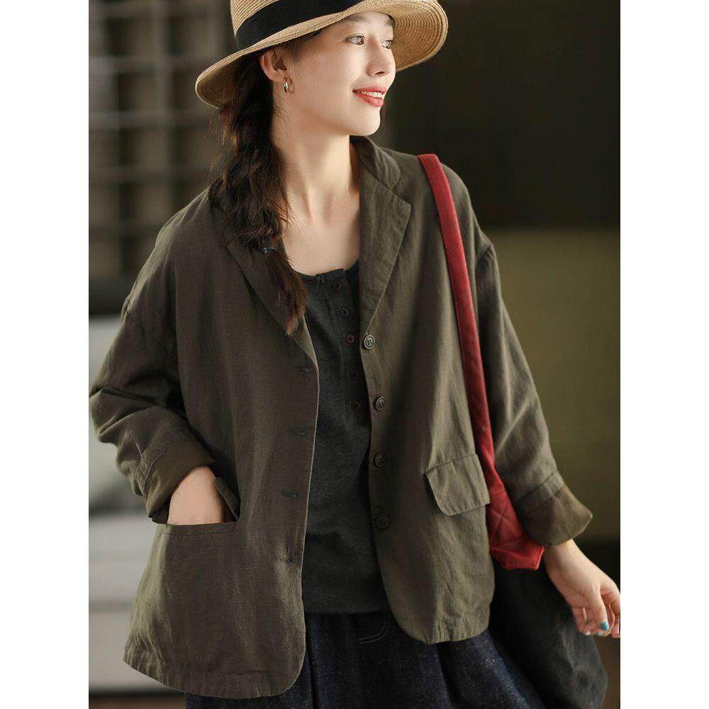 柒白2025秋季 简约文艺炒色高档亚麻西装 外套气质宽松外搭开衫 新款