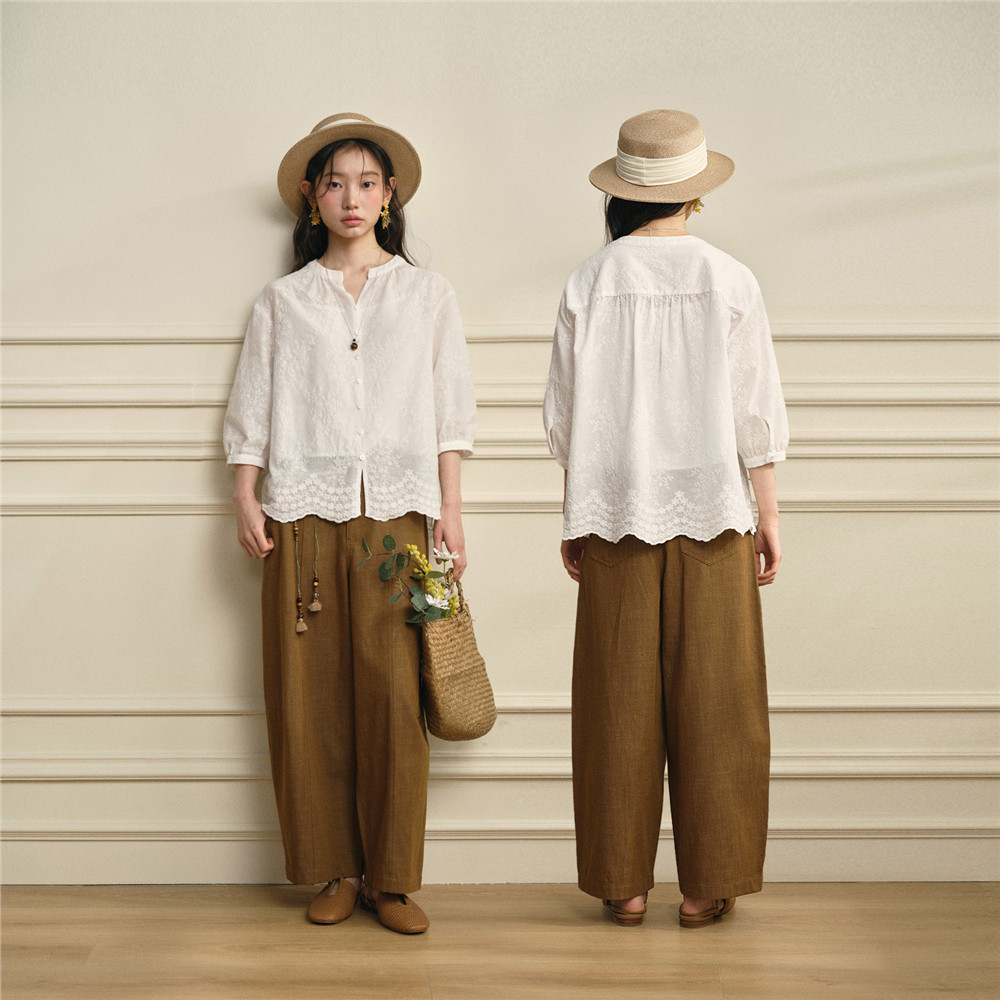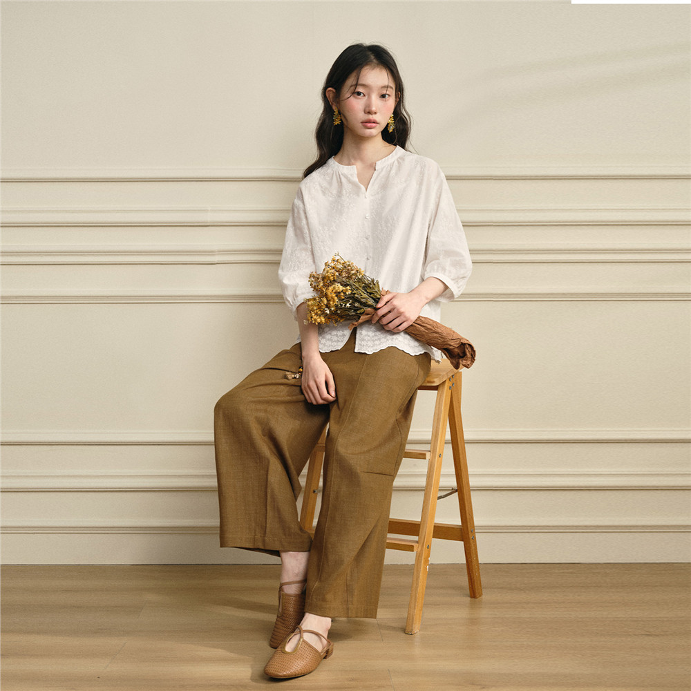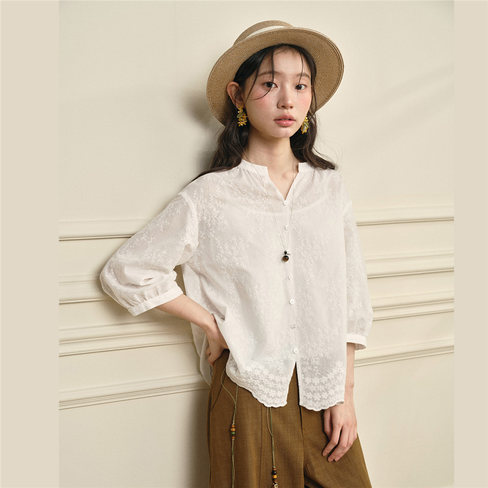 设计师款 配吊带绣花宽松V领七分袖 白色衬衫 女18346703 佐丹奴新款