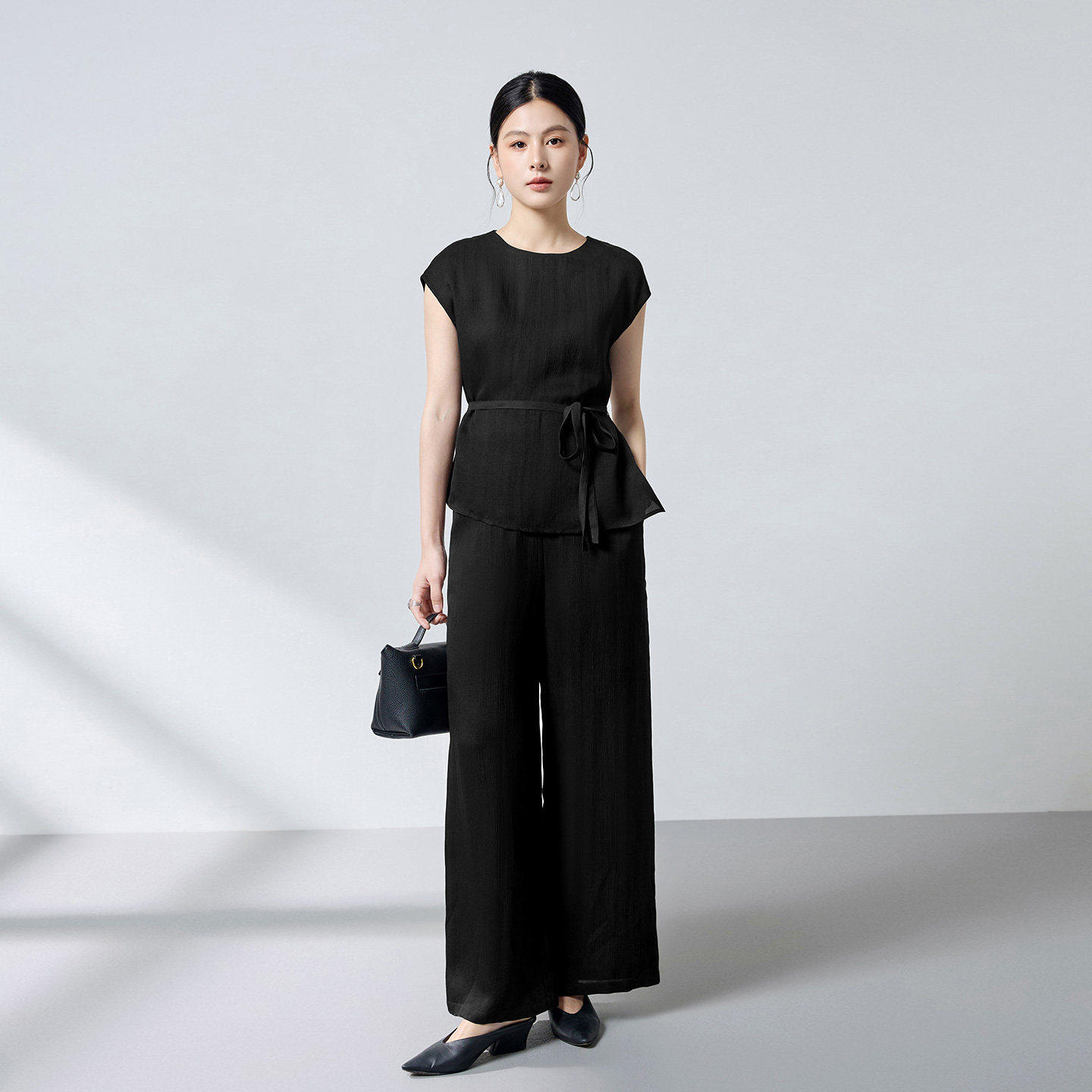 真丝泡泡绉香云纱上衣T恤大码 两件套装 圆领系带显瘦松紧腰阔腿裤