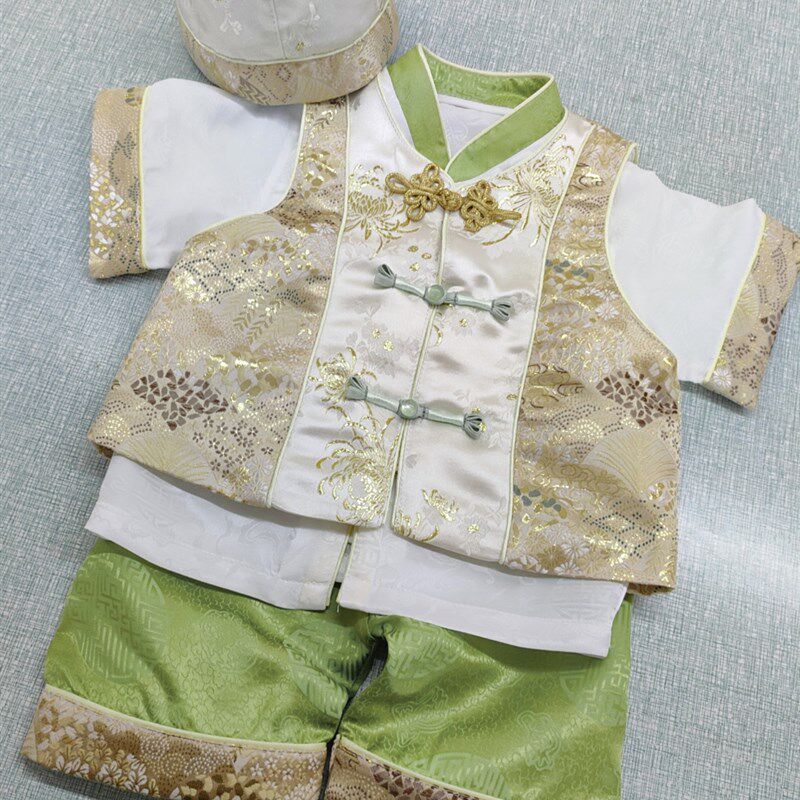 为您提供商品套装 宝宝周岁礼服男夏季 薄款 真丝y中式 婴儿一岁冠衣 国风抓周唐装的详细介绍,