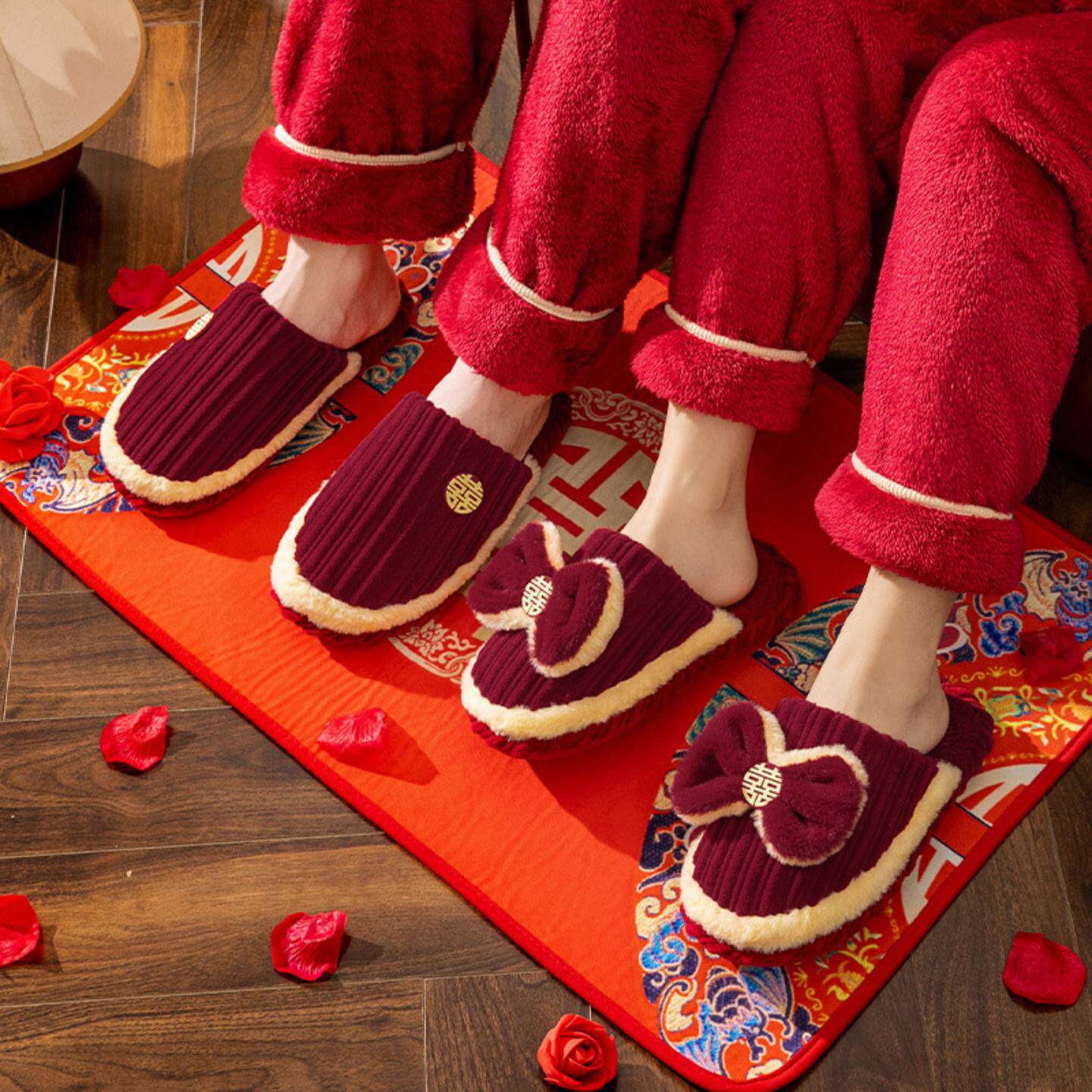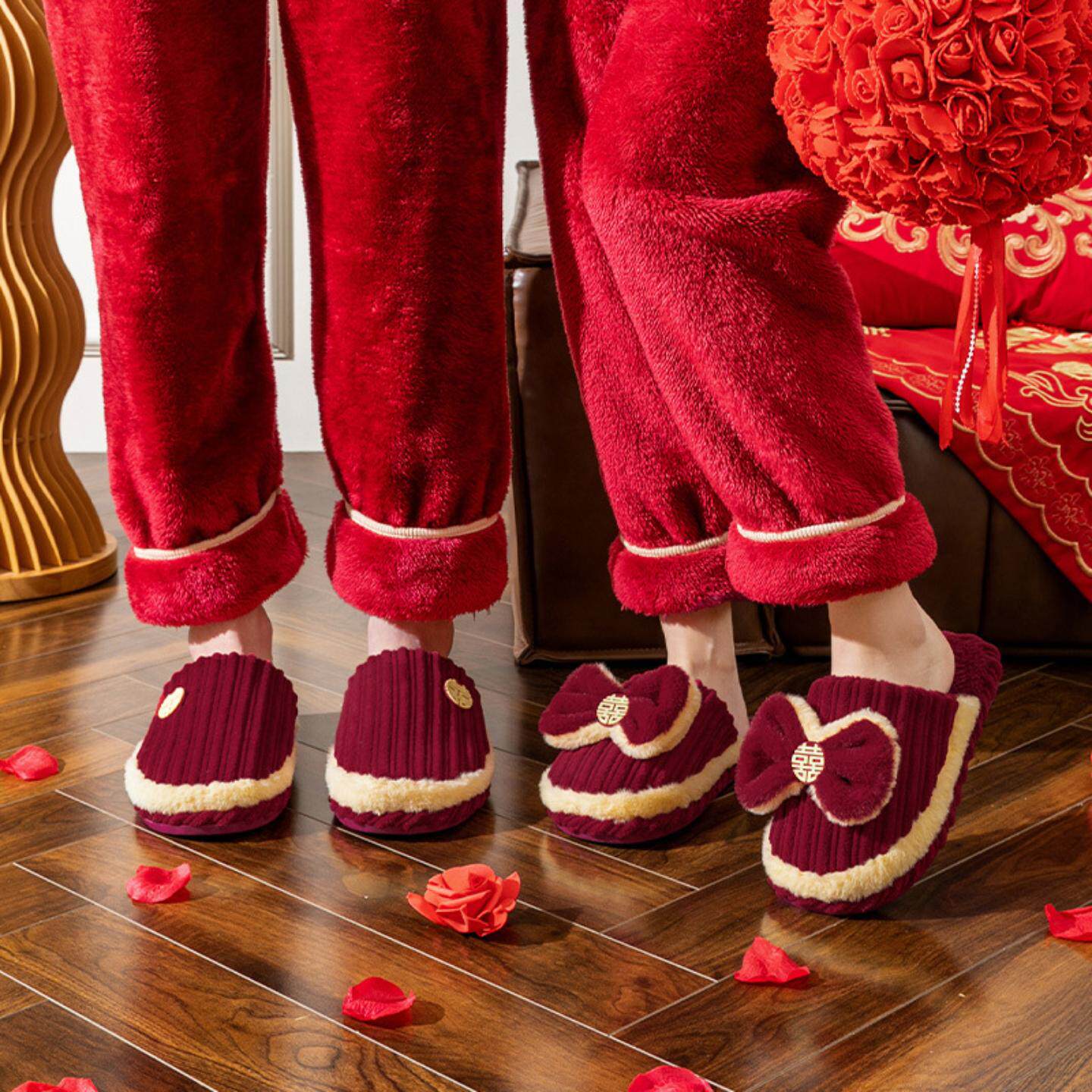 结婚棉拖鞋 冬 喜庆红色一对新婚陪嫁男女情侣新郎新娘婚庆保暖拖鞋