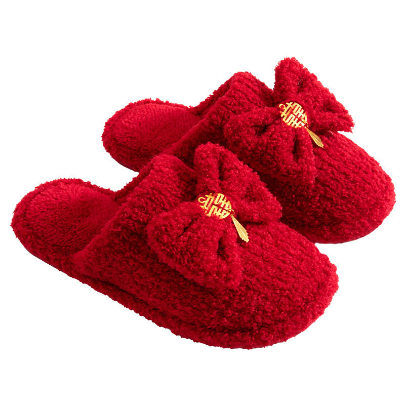一对红色喜庆蝴蝶结厚底防滑棉拖男女婚庆陪嫁居家 洁丽雅结婚拖鞋