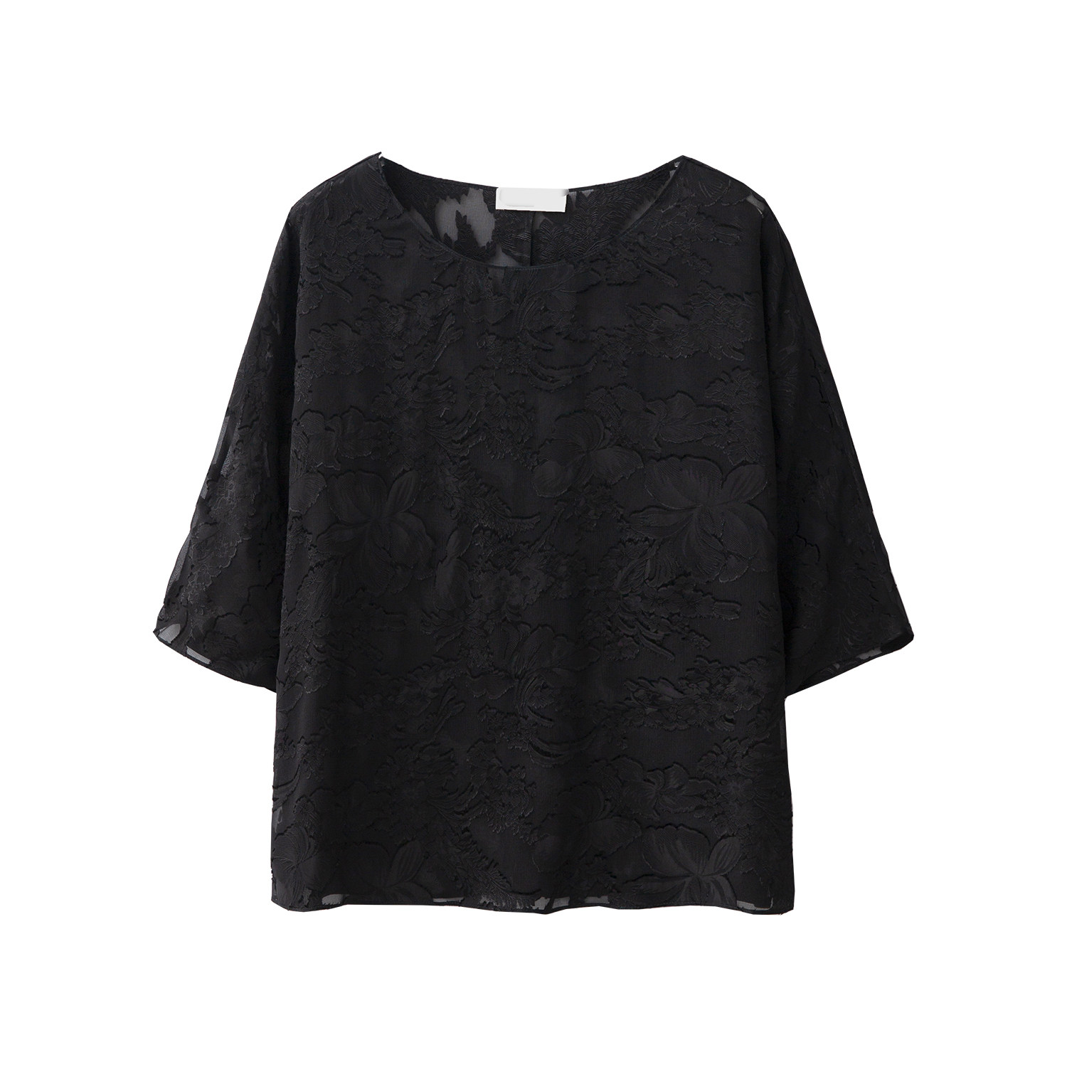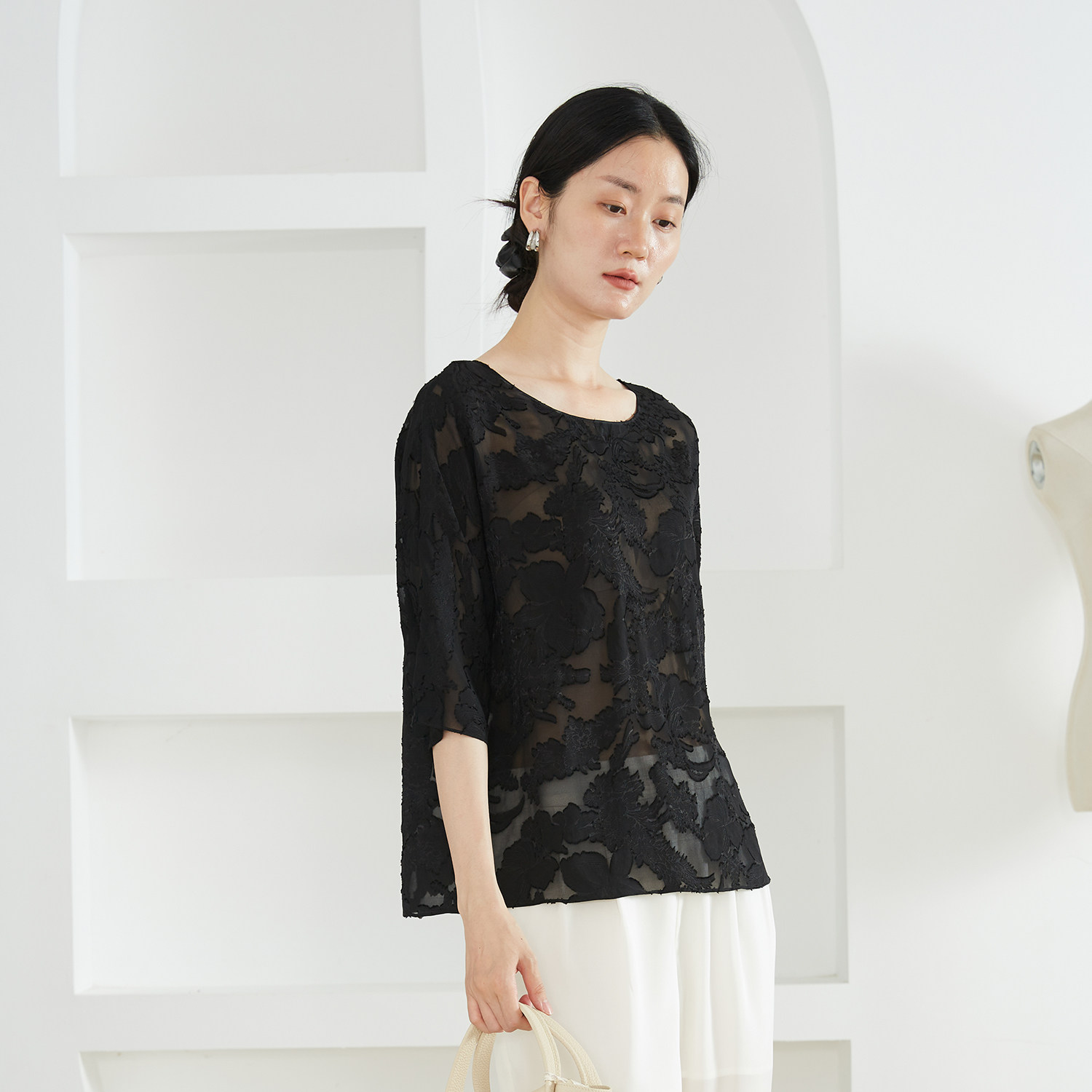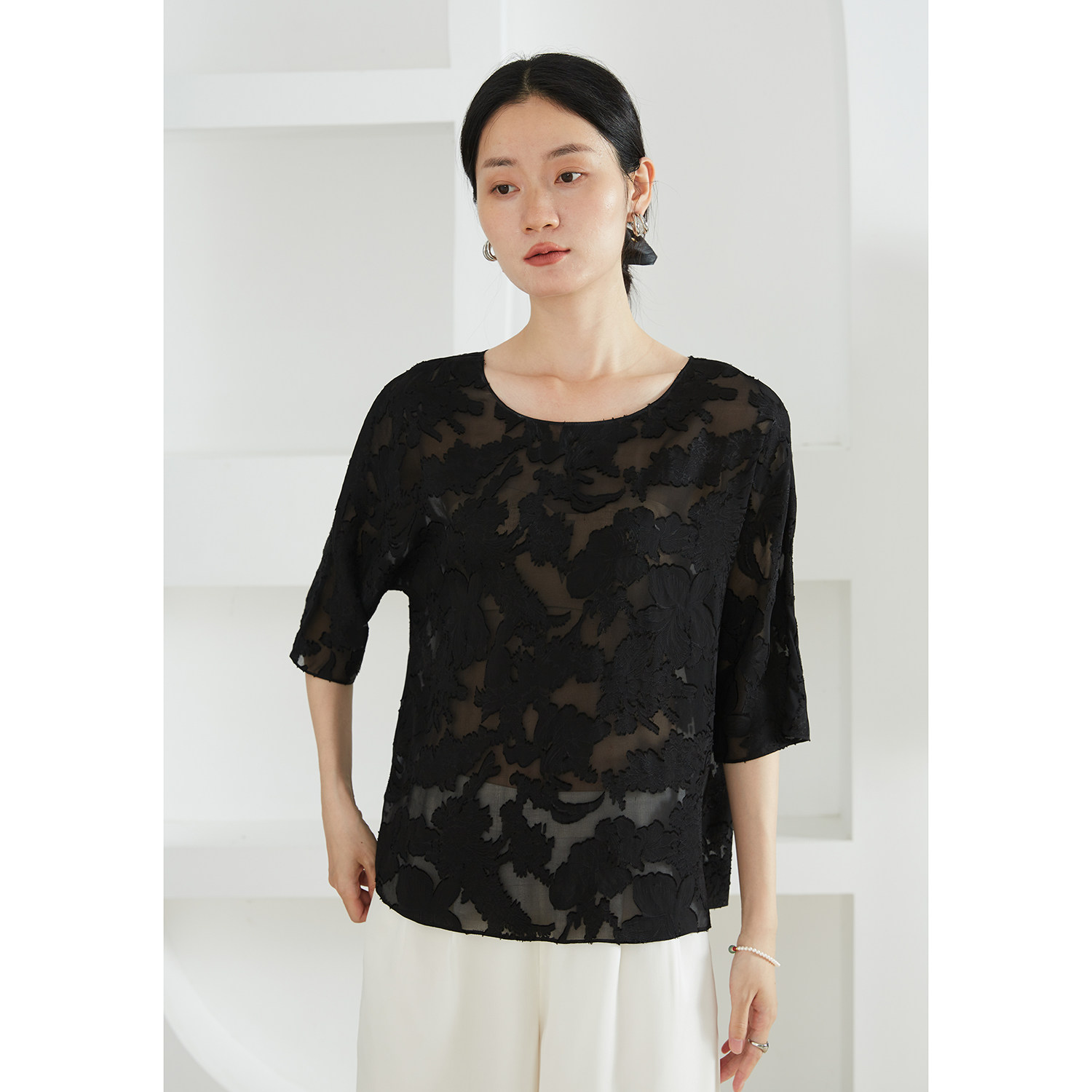 一丝牵 上衣夏女 真丝顺纡国风剪花绡圆领提花宽松100%桑蚕丝中袖