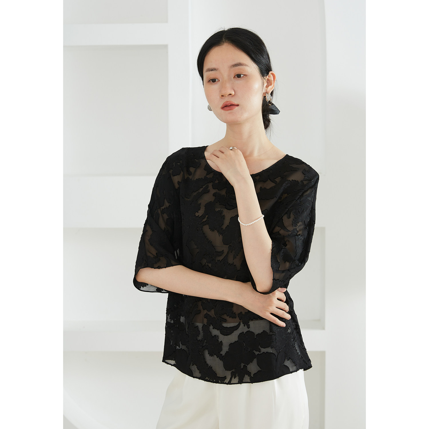 为您提供商品一丝牵 上衣夏女 真丝顺纡国风剪花绡圆领提花宽松100%桑蚕丝中袖的详细介绍,