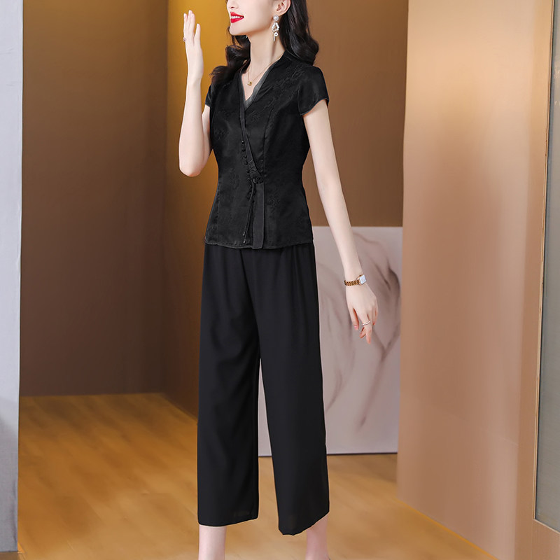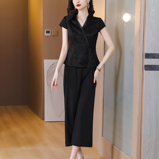 桑蚕丝花罗套装 真丝衬衣两件套香云纱上衣女阔腿裤 夏季 短袖 妈妈装