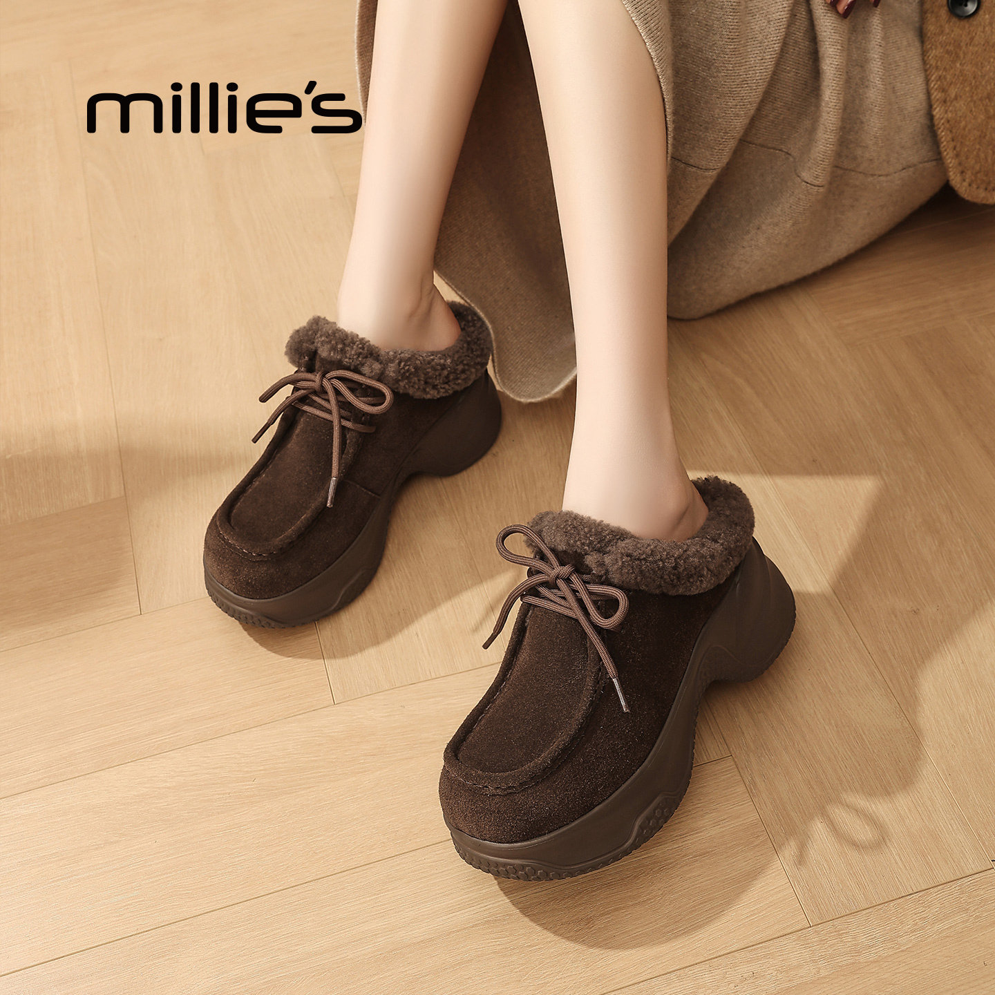 为您提供商品新款 妙丽2026冬季 英伦乐福鞋 厚底毛毛鞋 加绒保暖棉鞋 MILLIE的详细介绍,