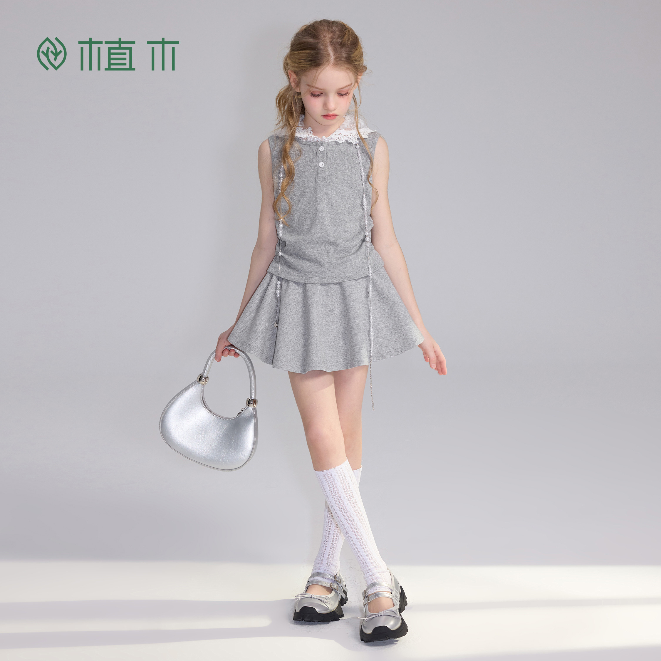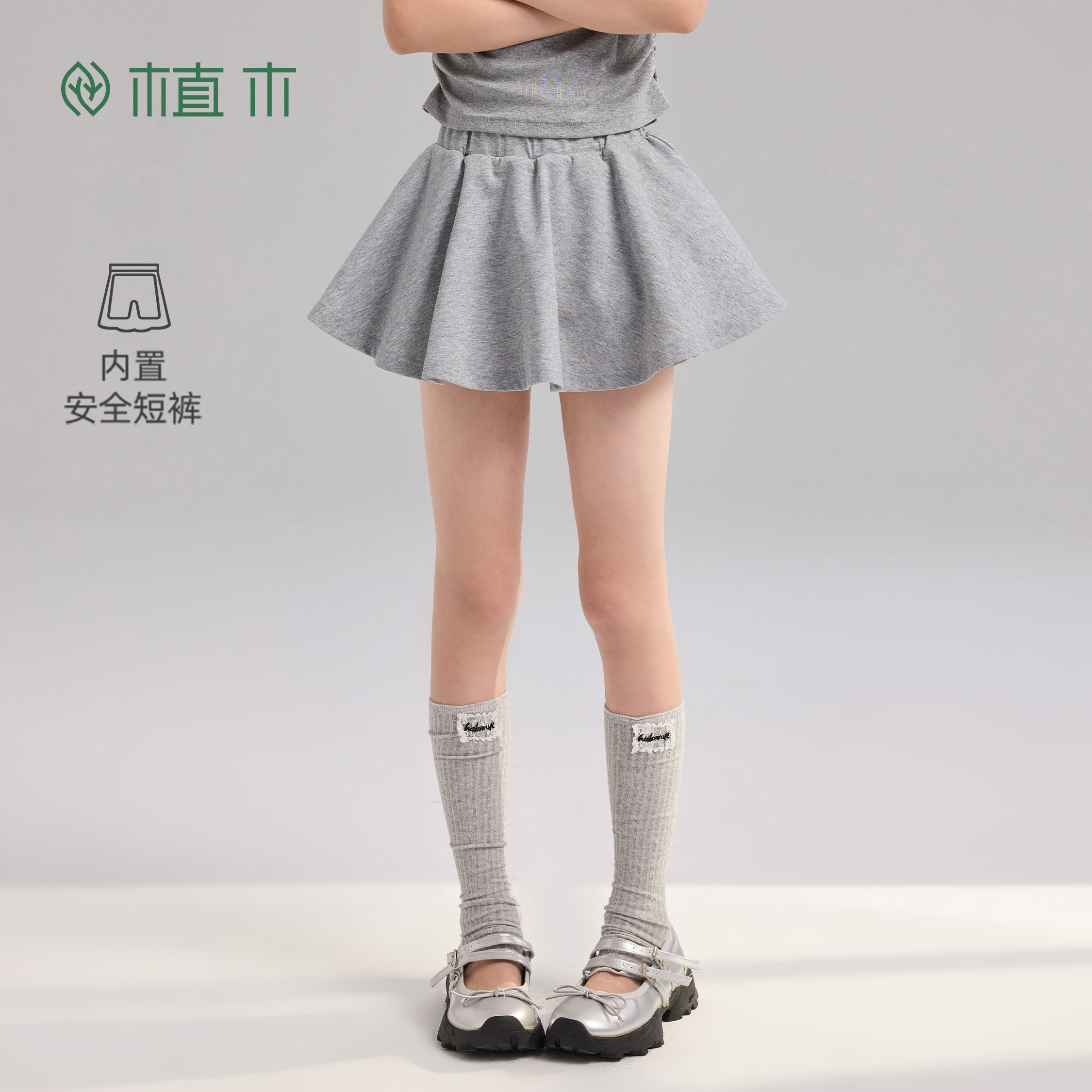 女童半身裙青少年夏季 植木 新 棉混纺A字裙 内置安全裤 软软 灰