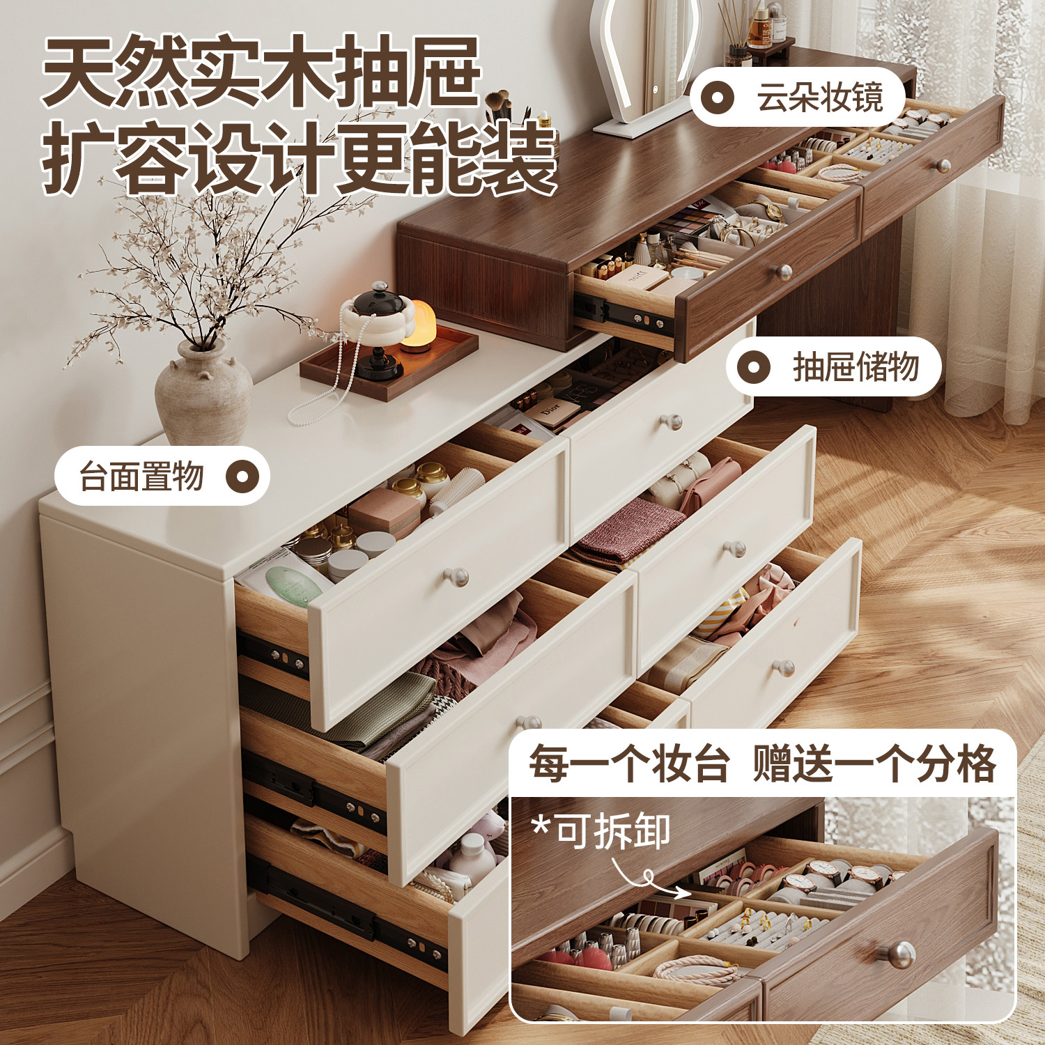 多层实木小户型梳妆台卧室现代简约奶油风斗柜一体化妆桌小型 新款