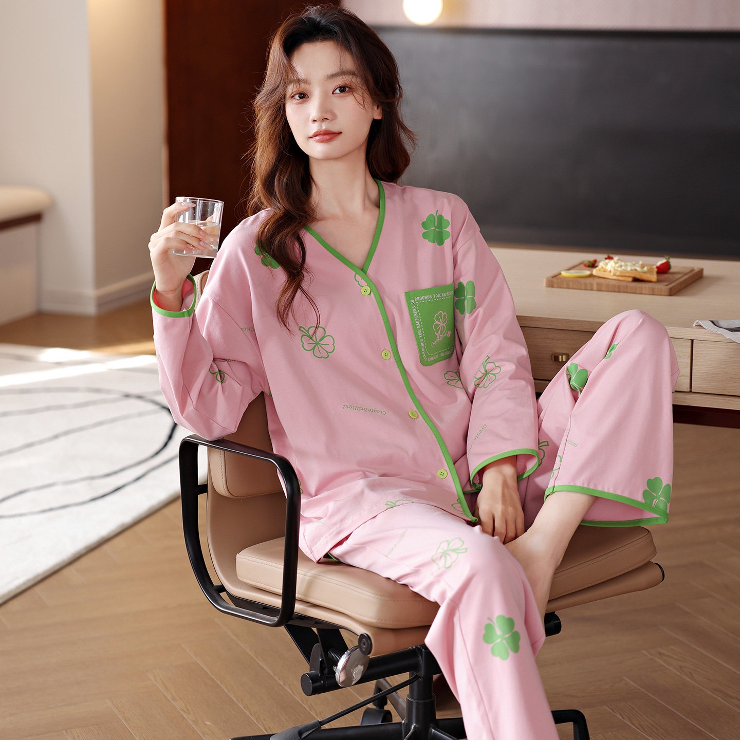 长裤 新中式 国风竹叶睡衣女春款 带胸垫长袖 甜美少女家居服套装