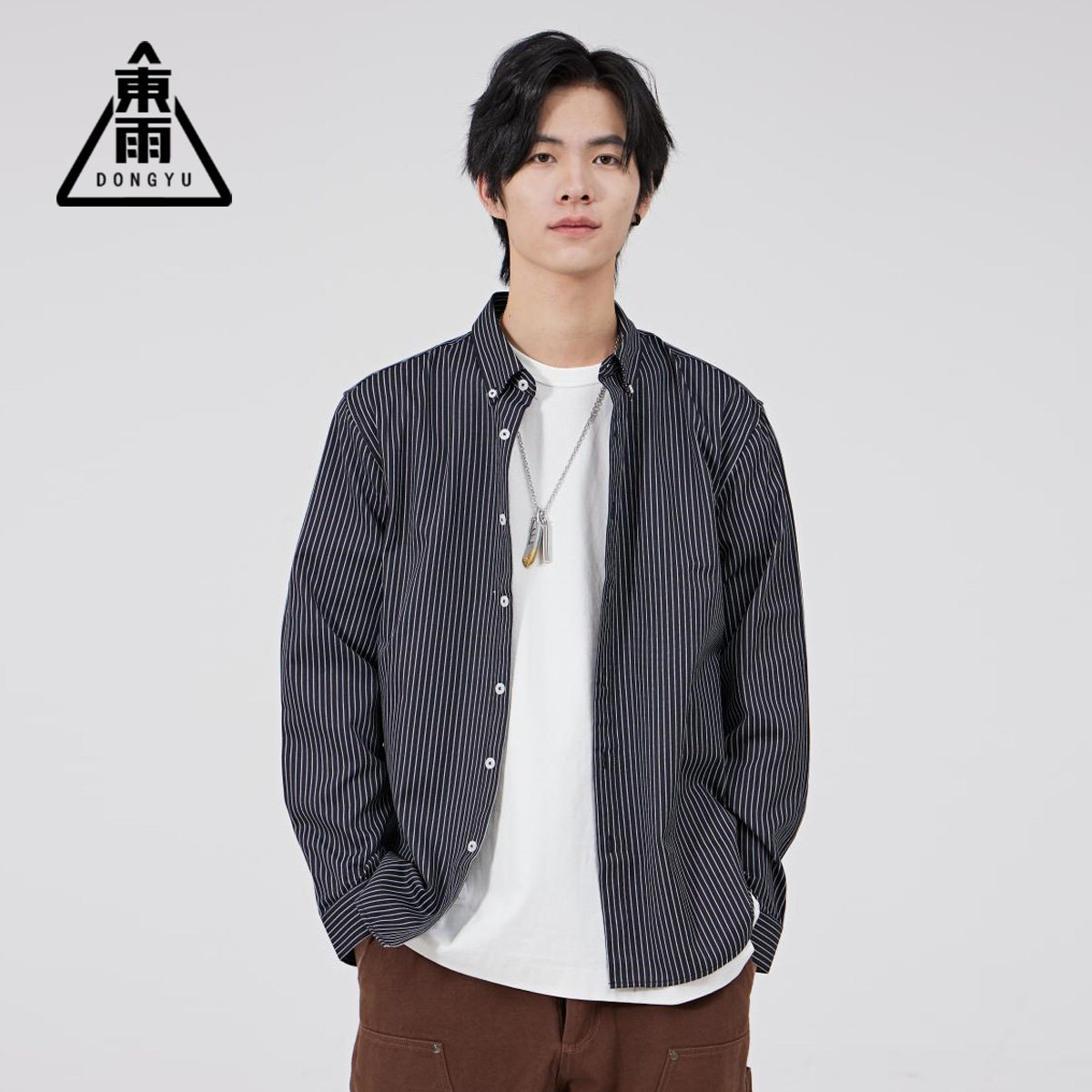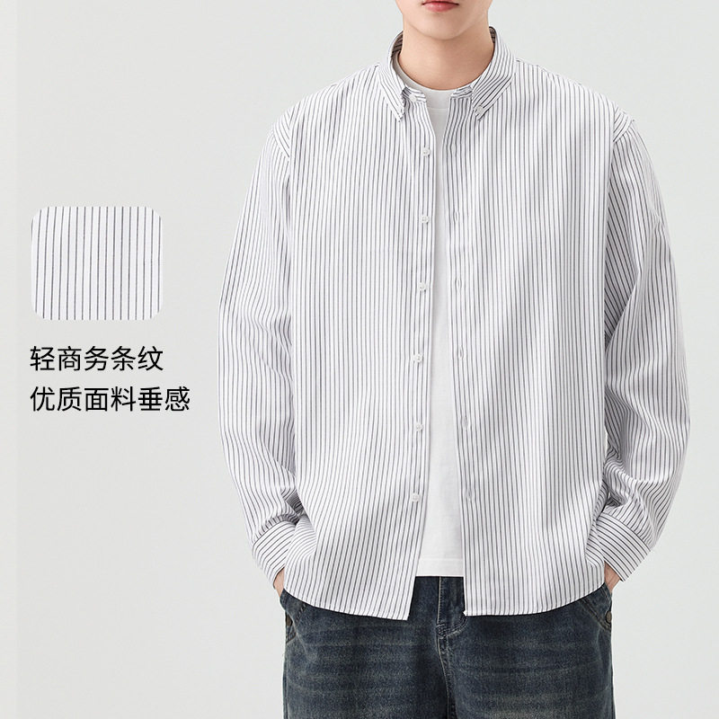 普通棉翻领衬衫 外套衬衣 秋冬灰色休闲条纹合体型青年长袖 東雨男装由