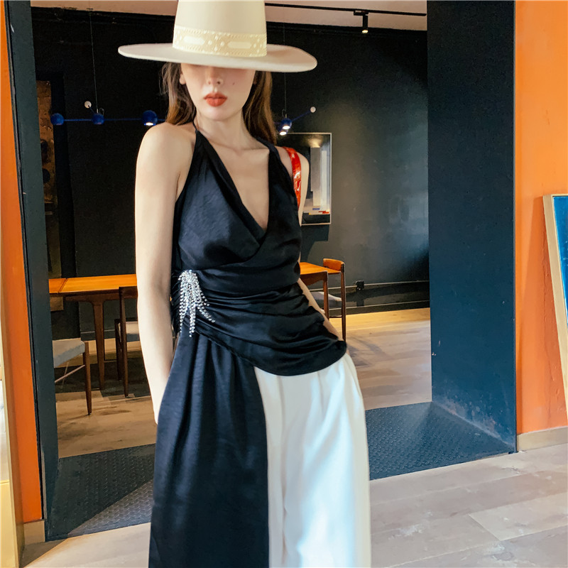 MISHA新款 黑色吊带性感V领高腰赫本风绑带流苏女木兰 折