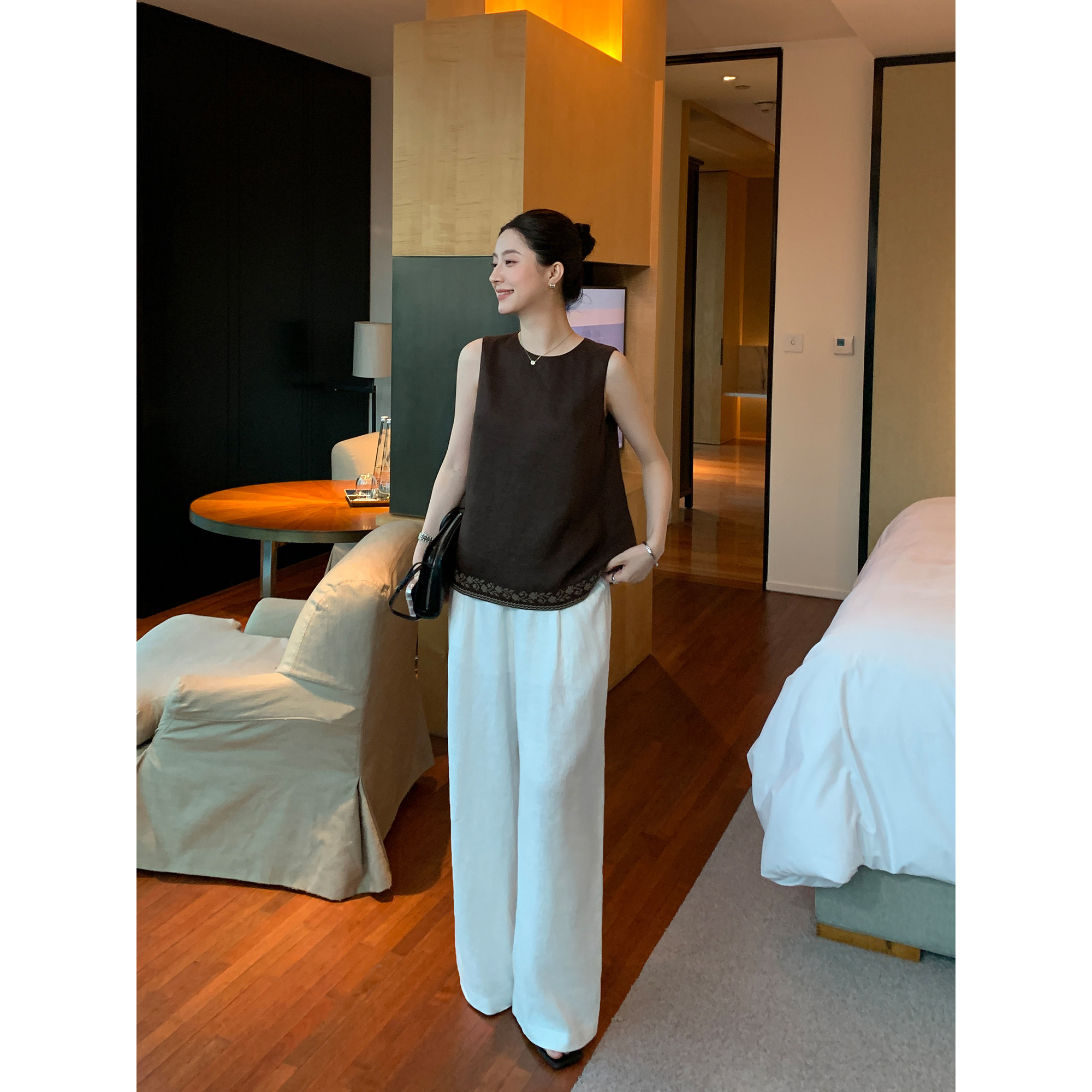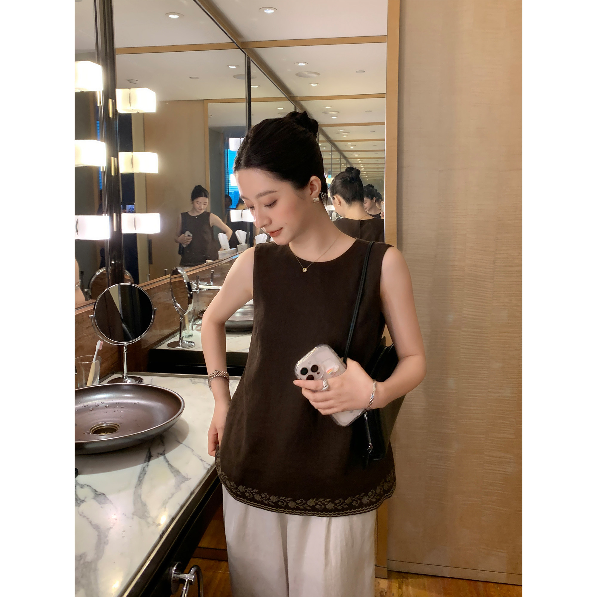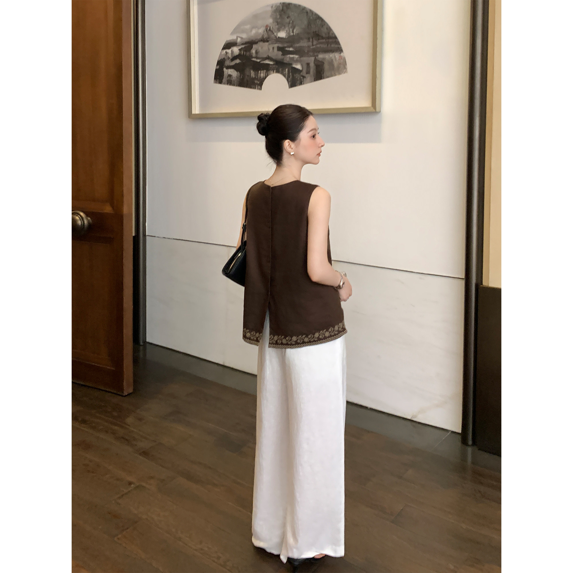 甄选1OO亚麻重工绣花无袖 上衣女复古宽松后背纽扣背心 Lin Maven由