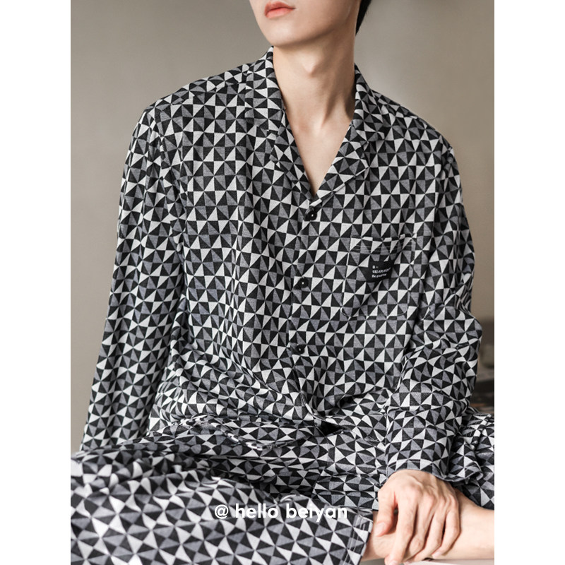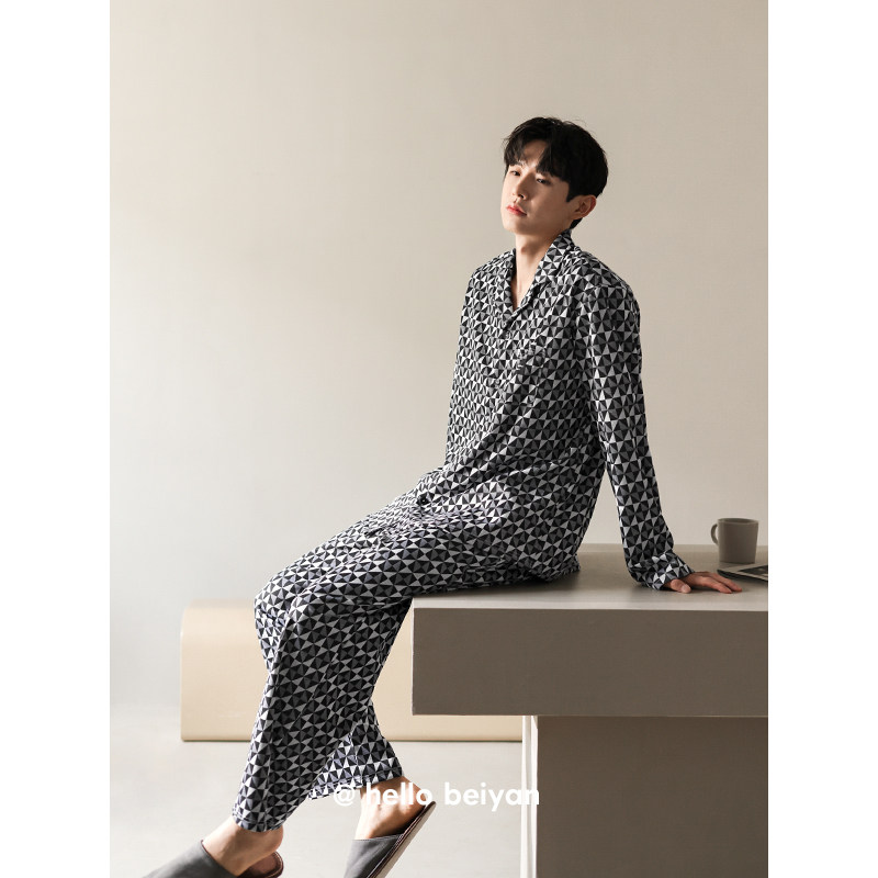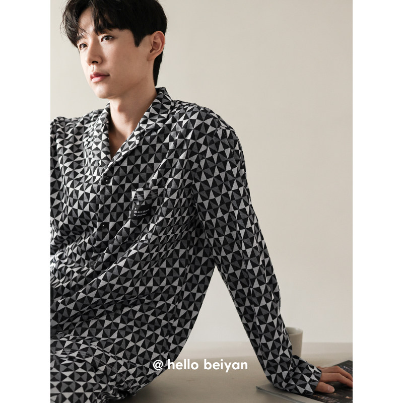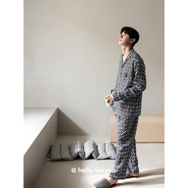 纯棉长袖 贝妍春秋季 男士 大码 外穿家居服套装 翻领男式 新款 睡衣时尚由