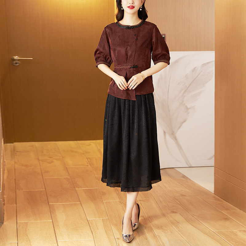 香云纱夏季 中老年刺绣上衣半身裙女洋气妈妈桑蚕丝两件套 真丝套装由