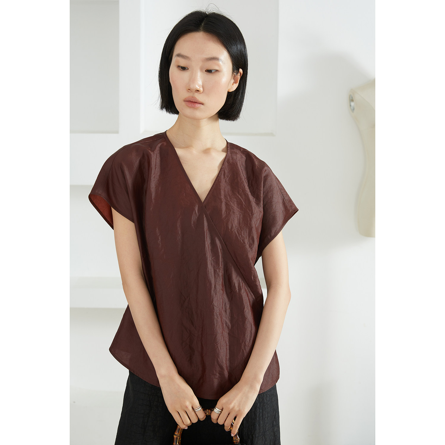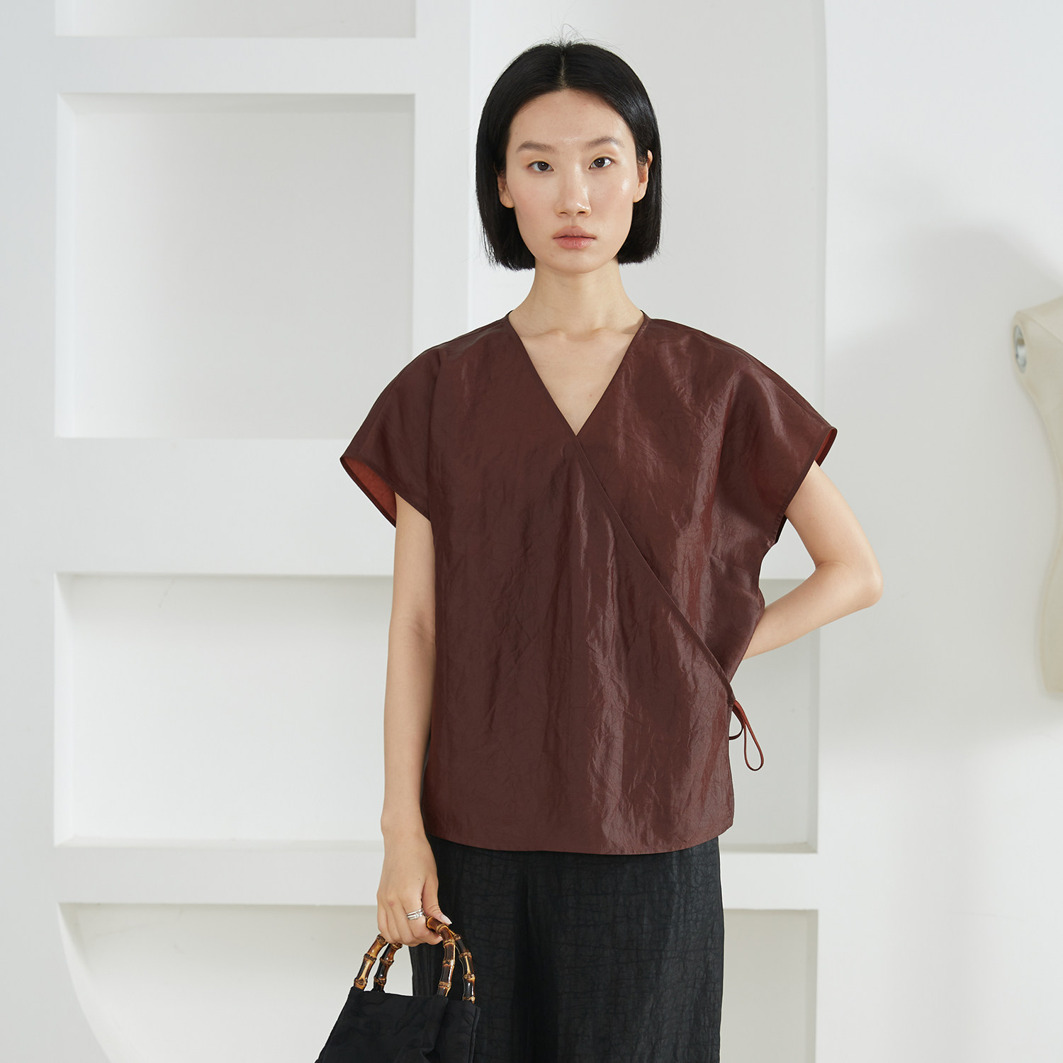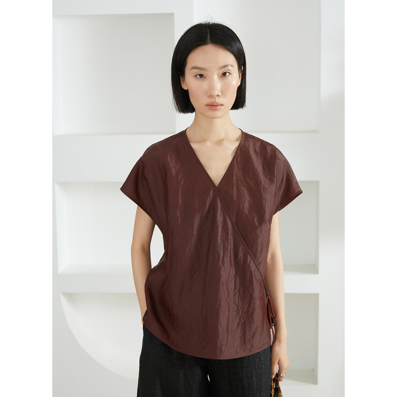 系带上衣女100%桑蚕丝V领短袖 上衣 真丝香云纱红云纱围裹式 一丝牵
