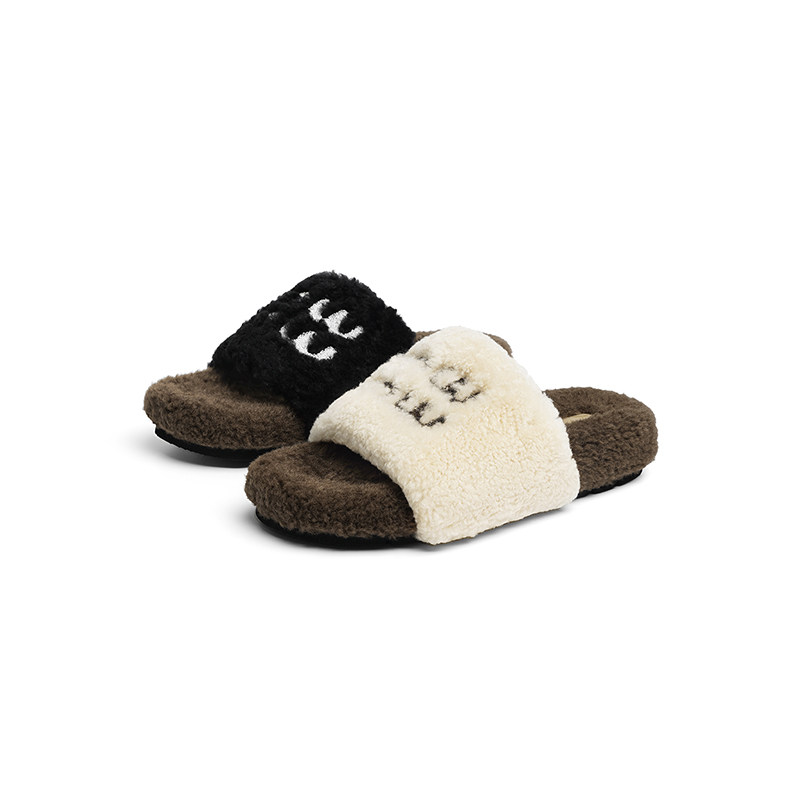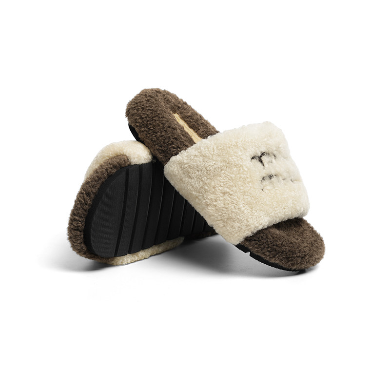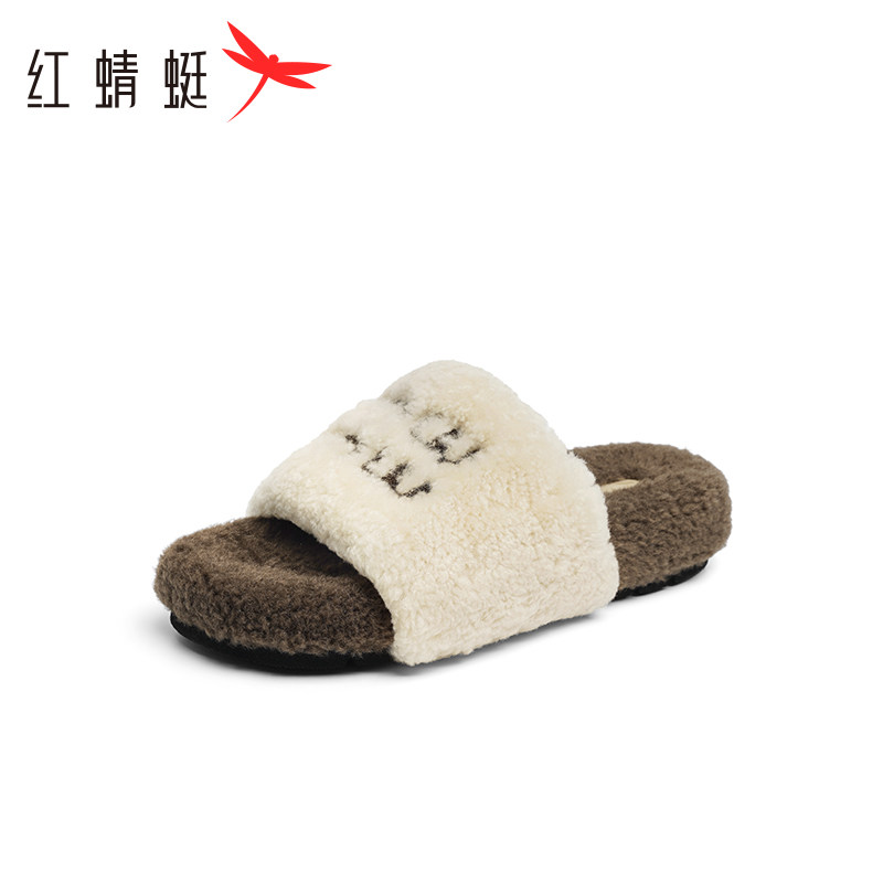 外穿一字拖女鞋 加绒保暖羊毛棉拖 女秋冬新款 红蜻蜓厚底毛毛拖鞋由