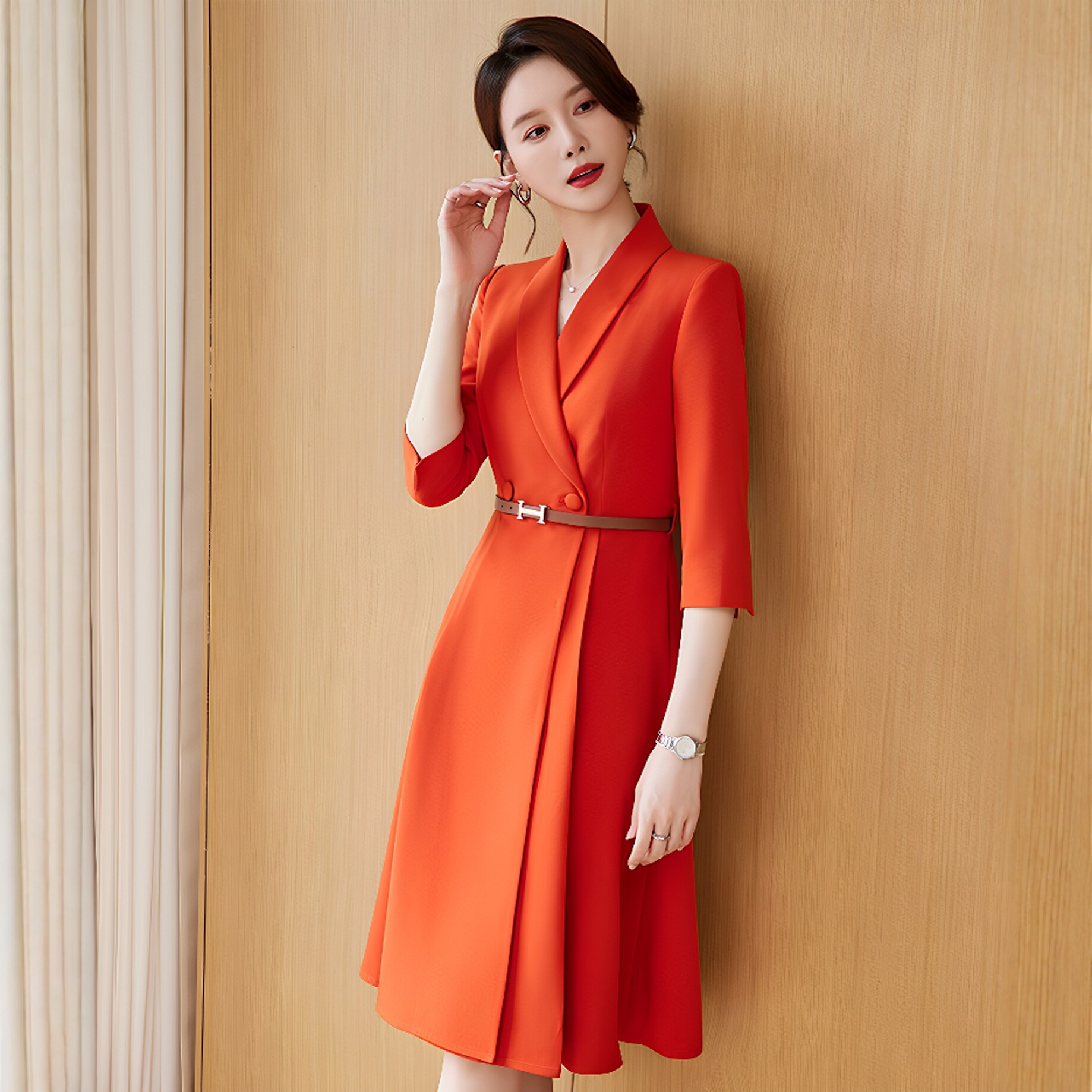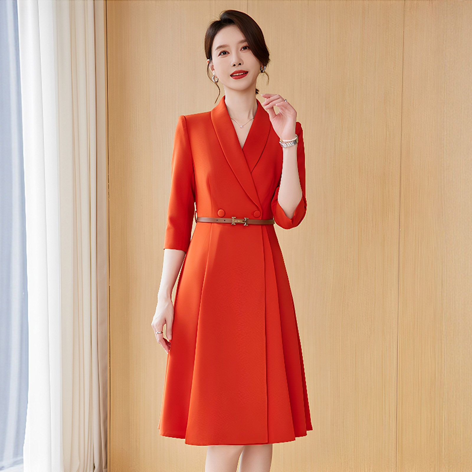 大码 西装 连衣裙女胖MM橙红色主持人宽松收腰显瘦职业装 礼服裙 正装